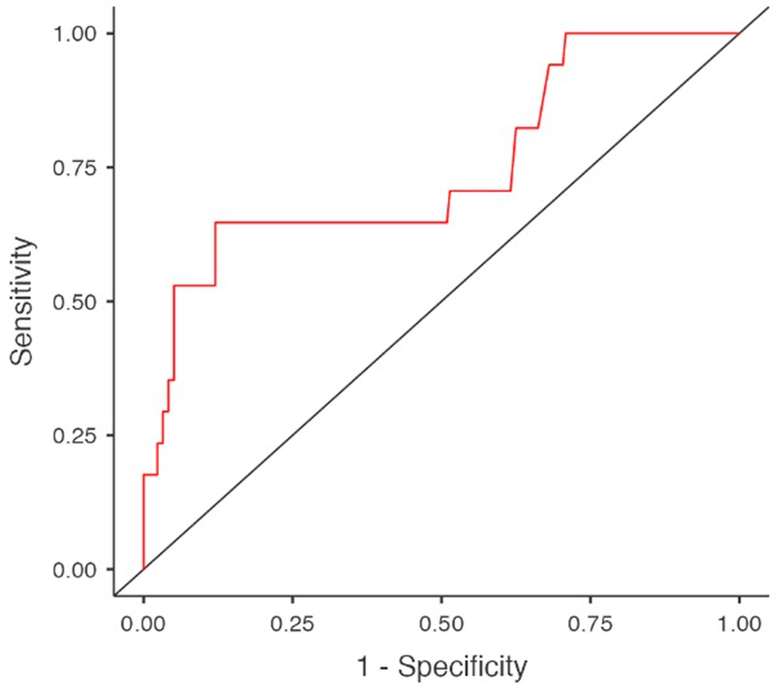 | Diabetes | 17 (25.75%) | 5 (33.33%) | 12 (23.52%) | 0.445 |