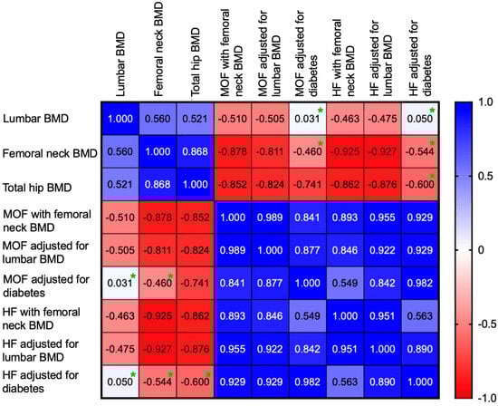 Heatmap showing the correlation coefficients between lumbar BMD, femoral neck BMD, total hip BMD and 10-year fracture risk score (green asterisk = correlations with p > 0.05).