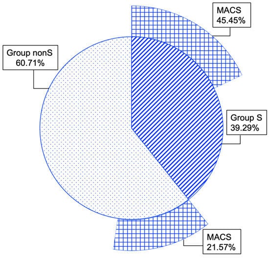 As mentioned, the entire cohort was split into group S (39.29%) and group nonS (60.71%). Additionally, MACS-positive tumours within groups S and nonS showed a rate of 45.45% and 21.57%, respectively, with a statistically significant difference (p = 0.021) (Figure 6).