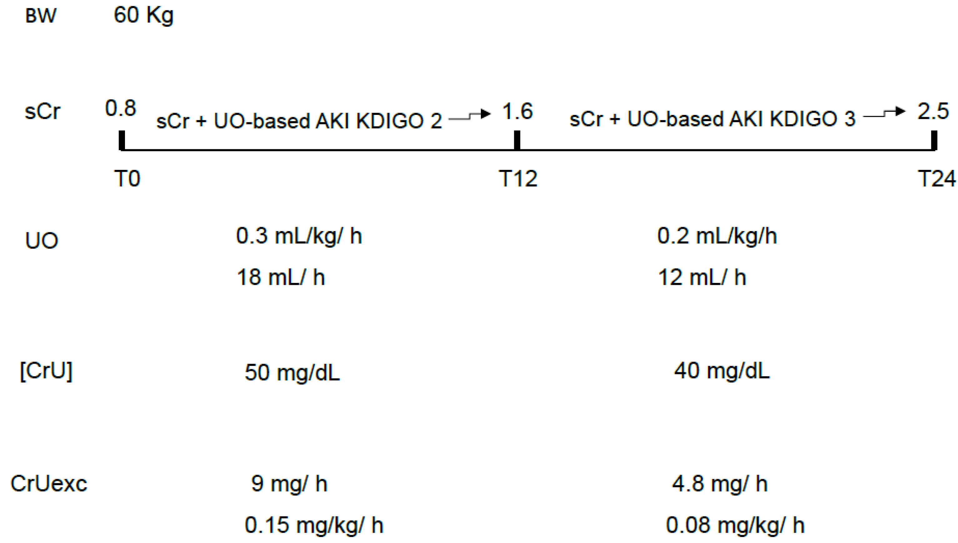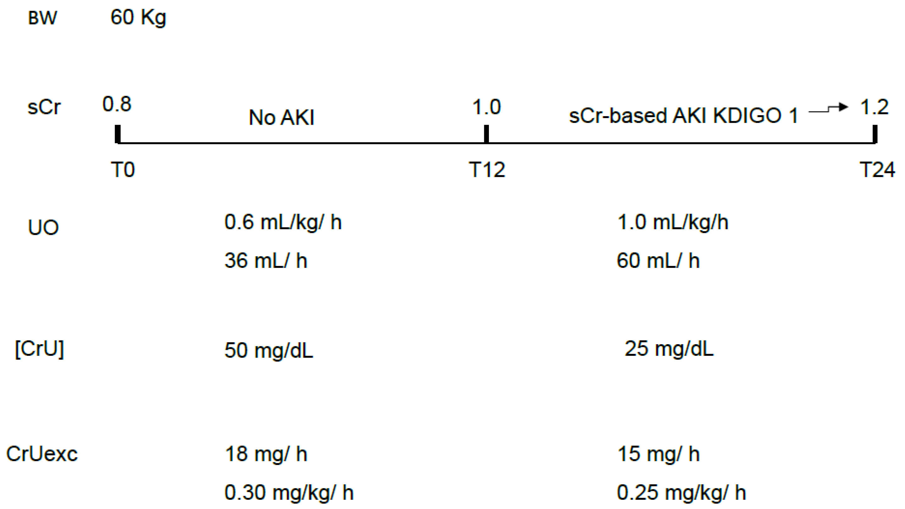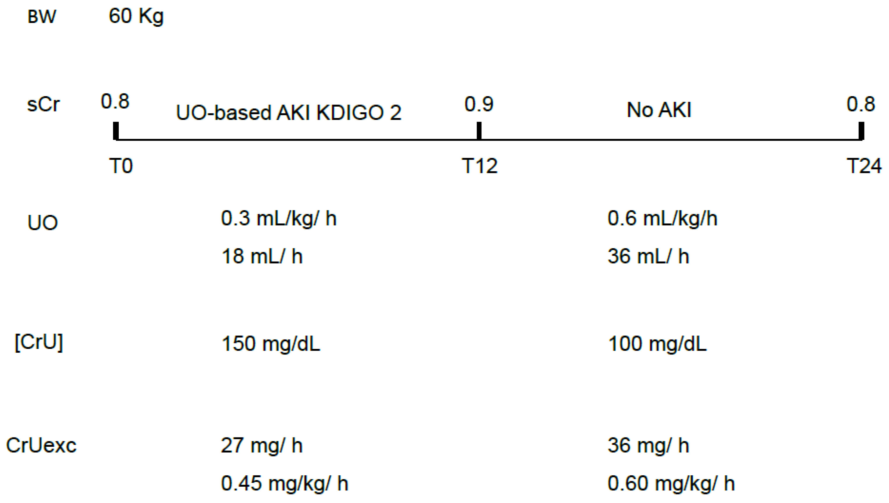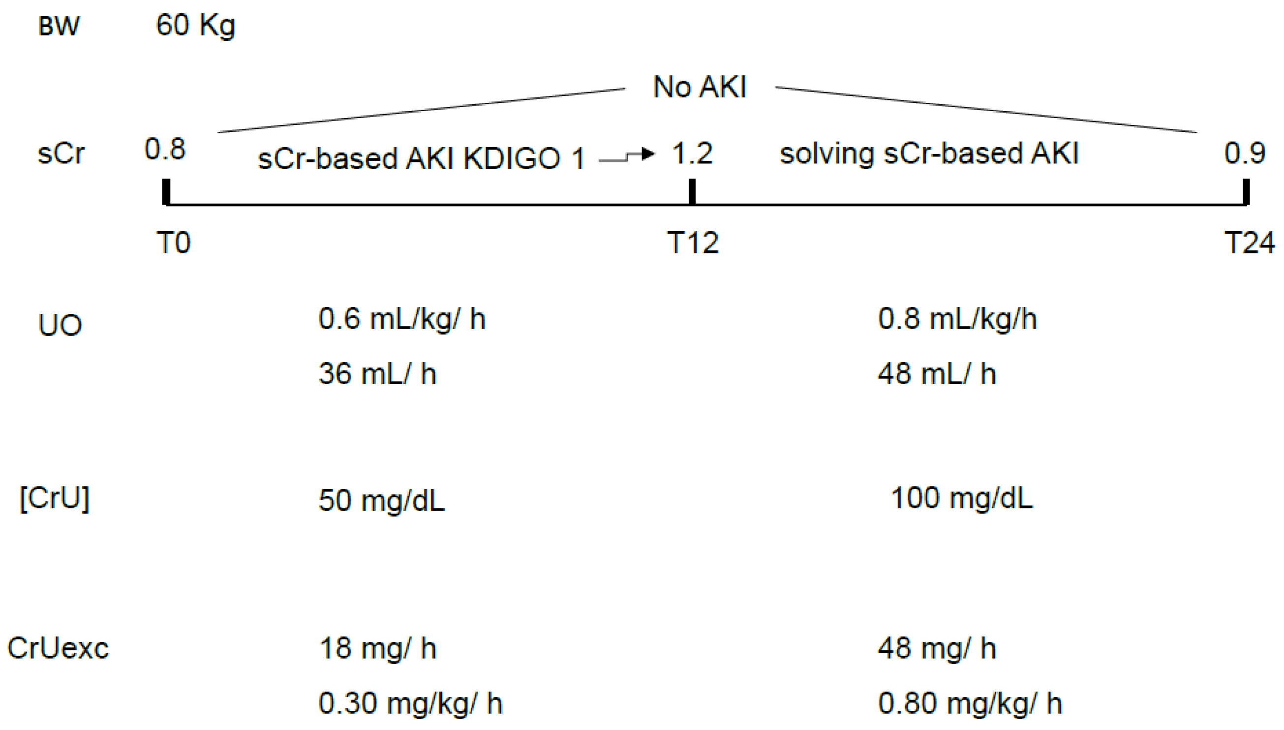 - Oliguria may be transient, compromising CrUexc and leading to UO-based AKI diagnosis but not being severe and long enough to allow sCr to increase 0.3 mg/dL in 2 days or 50% in 7 days (transient and short-lasting decreases in CrUexc). In this case, the magnitude and/or duration of the CrUexc decrease are expected to be lower than that which leads to a rise in sCr (Figure 1).