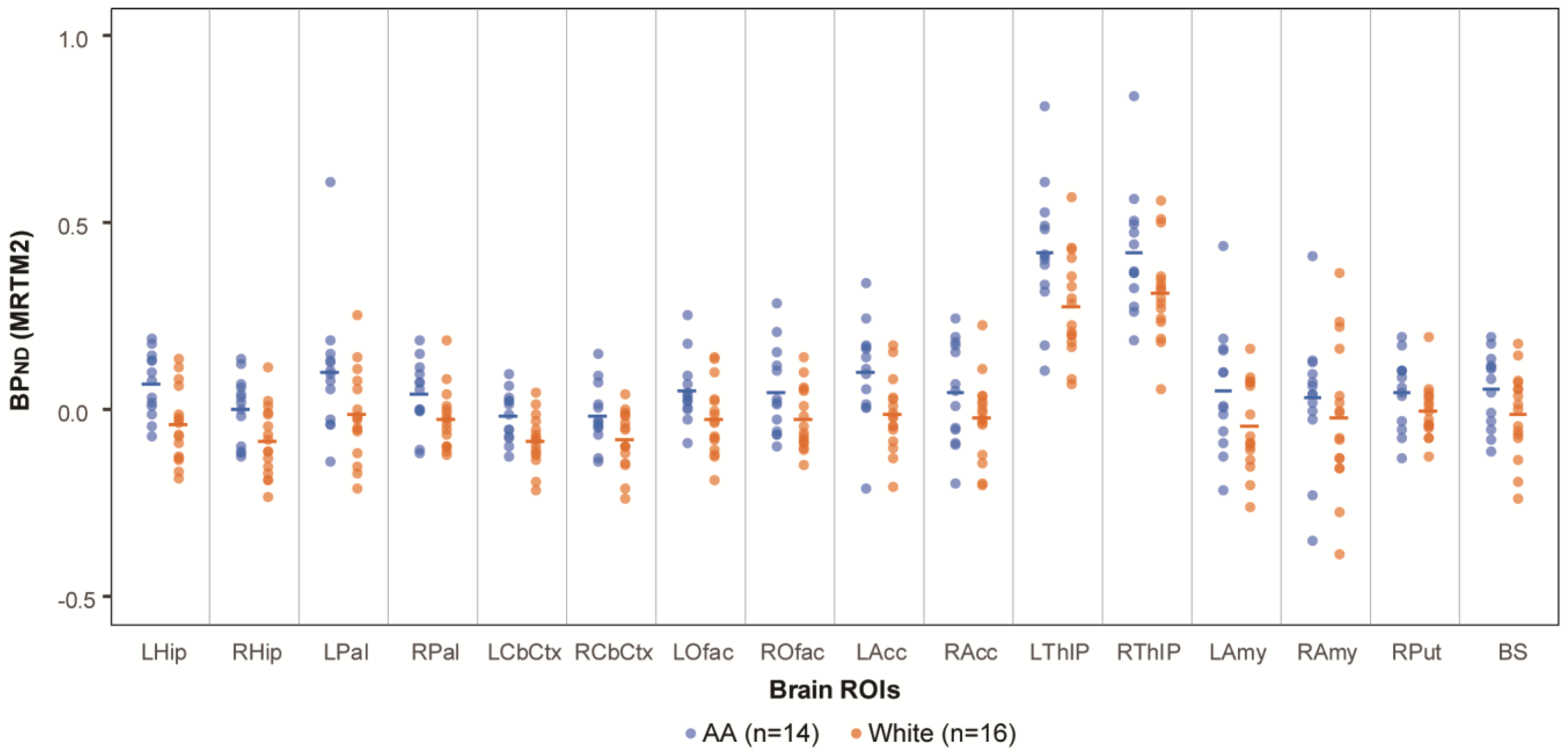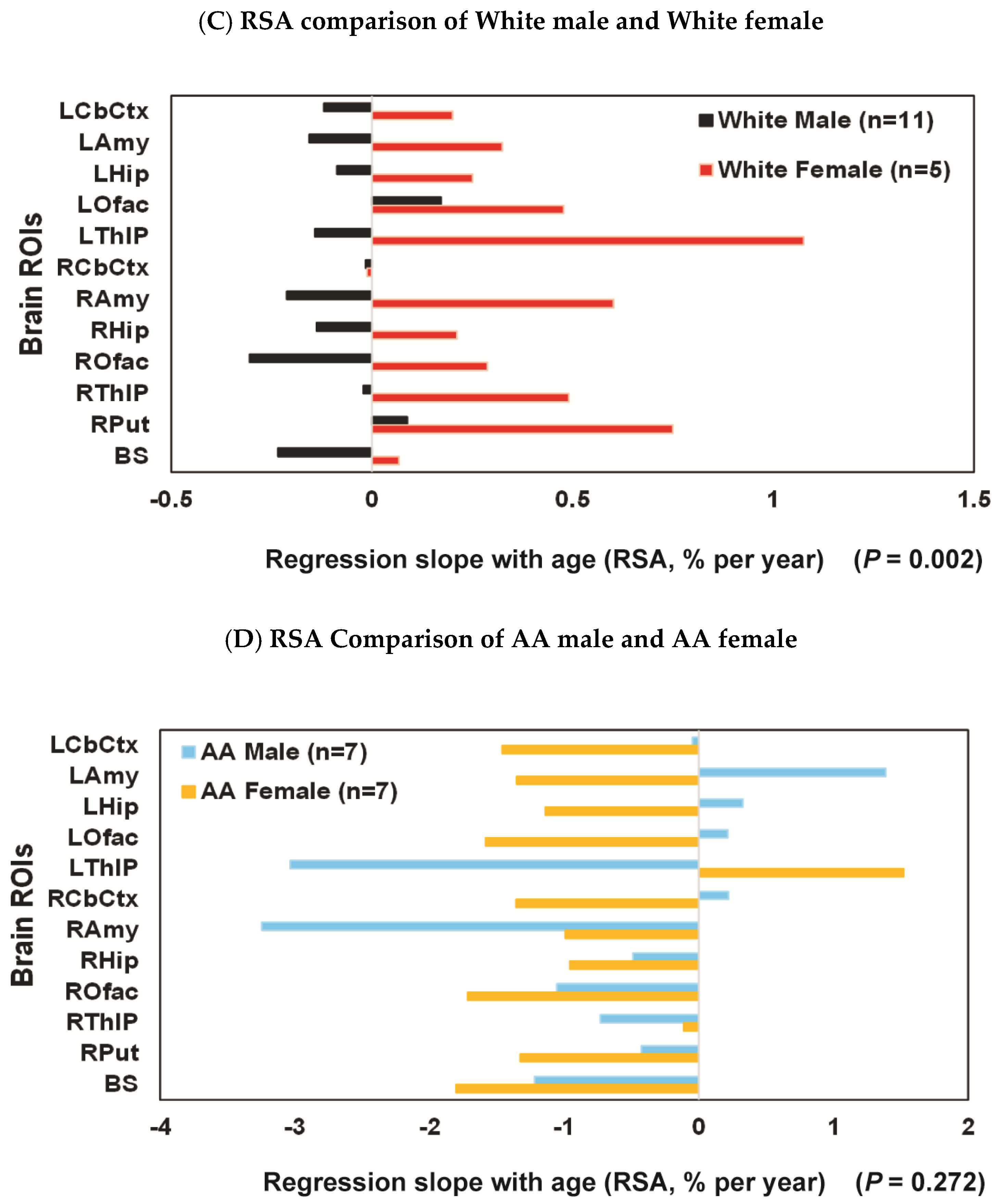 | AA (n = 14) | 16 ROIs a | Mean (SD) | −0.58 (1.51) | −0.97 (0.90) | 0.234 |