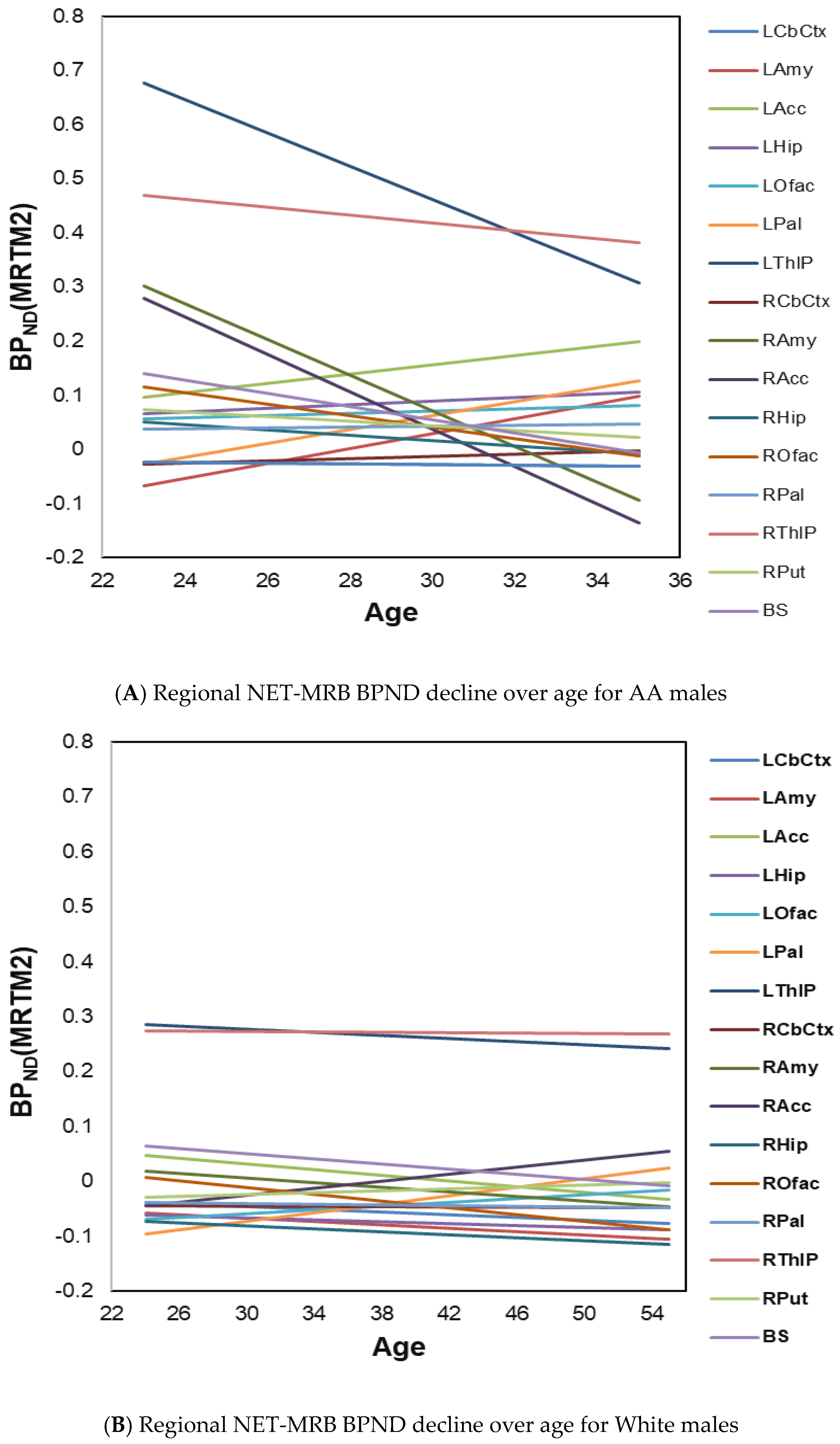 3.2. Race Effects and Sex Effects on Age-Associated Decline Rate of Regional NET Availability