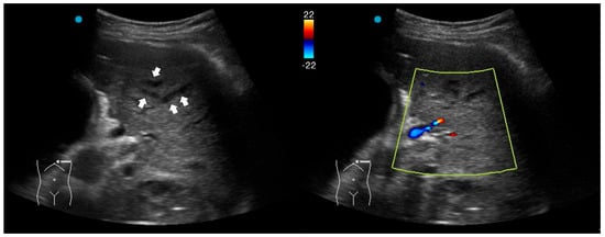 Another LUS sign of necrotizing pneumonia in children was the presence of a heterogeneous hypoechoic consolidation containing more hypoechoic confluent lesions [29]. These hypoechoic lesions were thought to correspond to necrotic cavities. Adult studies have shown that the presence of micro-abscesses or hypoechoic areas within consolidations may suggest necrotizing changes, prompting further confirmation with a repetitive CT in suspicious patients (Figure 3) [30,31].