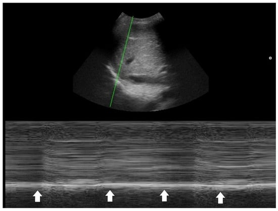 M-mode tracing of the diaphragm (green line indicates the scanning line) showed minimal respiratory excursion (arrows), indicating poor diaphragm function.