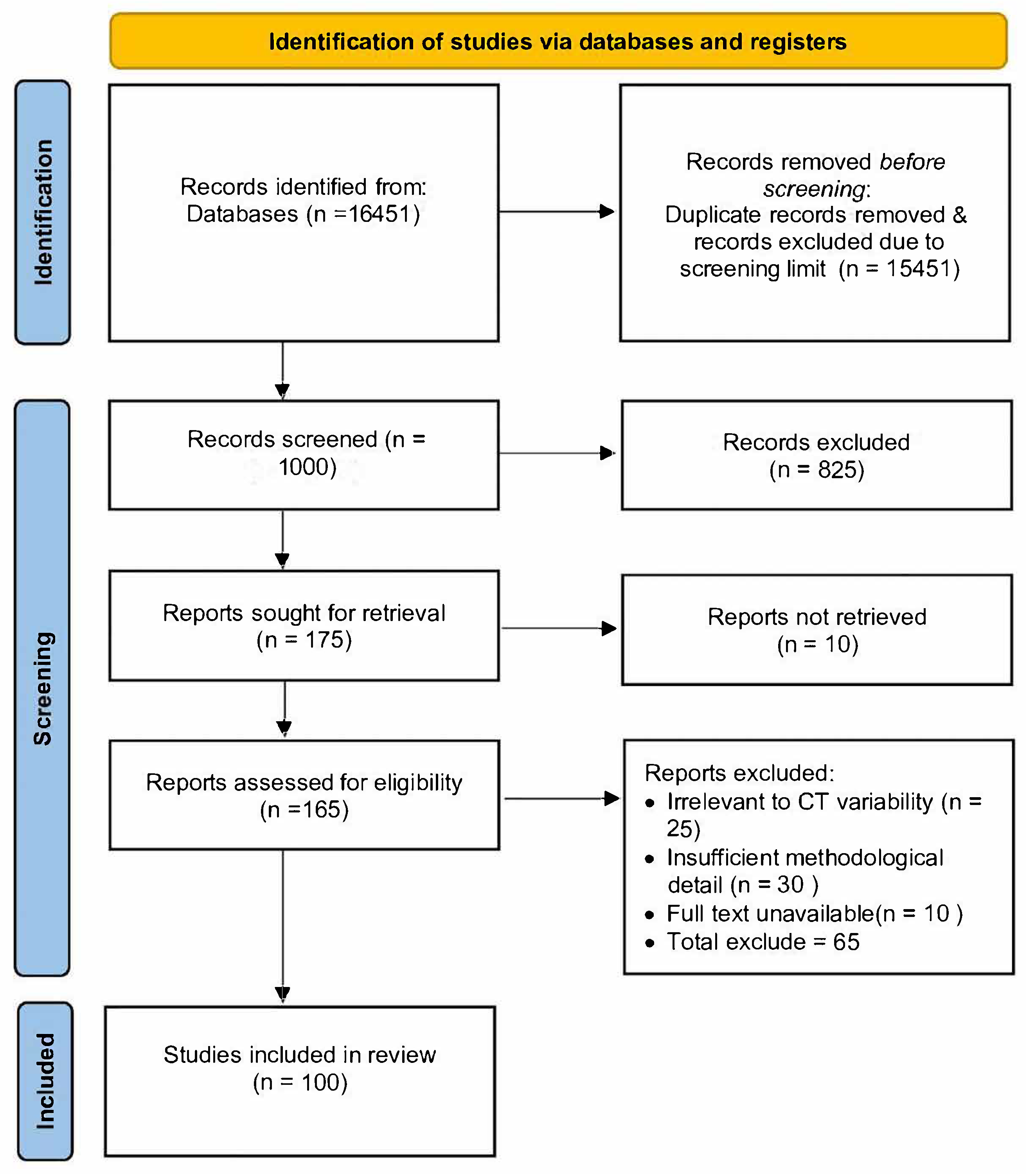 The combined search retrieved 16,451 records, including 15,900 from Google Scholar. Given the large volume of results in Google Scholar, only the top 500 most relevant records were screened, while the remaining records were excluded due to the screening threshold. After removing duplicates and applying this threshold, 1000 unique records underwent title and abstract screening. Of these, 825 were excluded due to irrelevance (non-CT imaging, non-AI, or non-peer-reviewed sources). Full texts of 175 studies were assessed for eligibility, and 100 met all inclusion criteria (