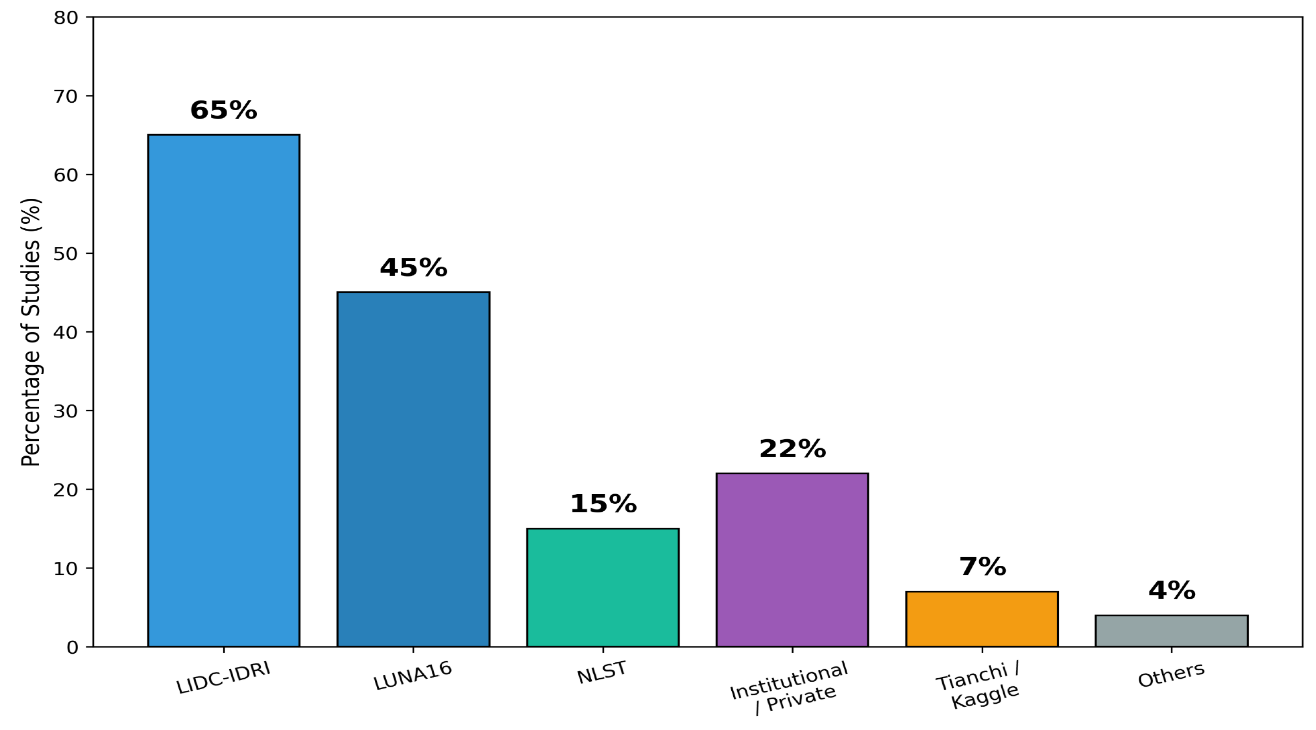 Figure 3, the LIDC-IDRI dataset was the most widely used resource, appearing in more than half of the studies. Its detailed radiologist annotations and slice-level labels make it highly suitable for training and validating AI models [