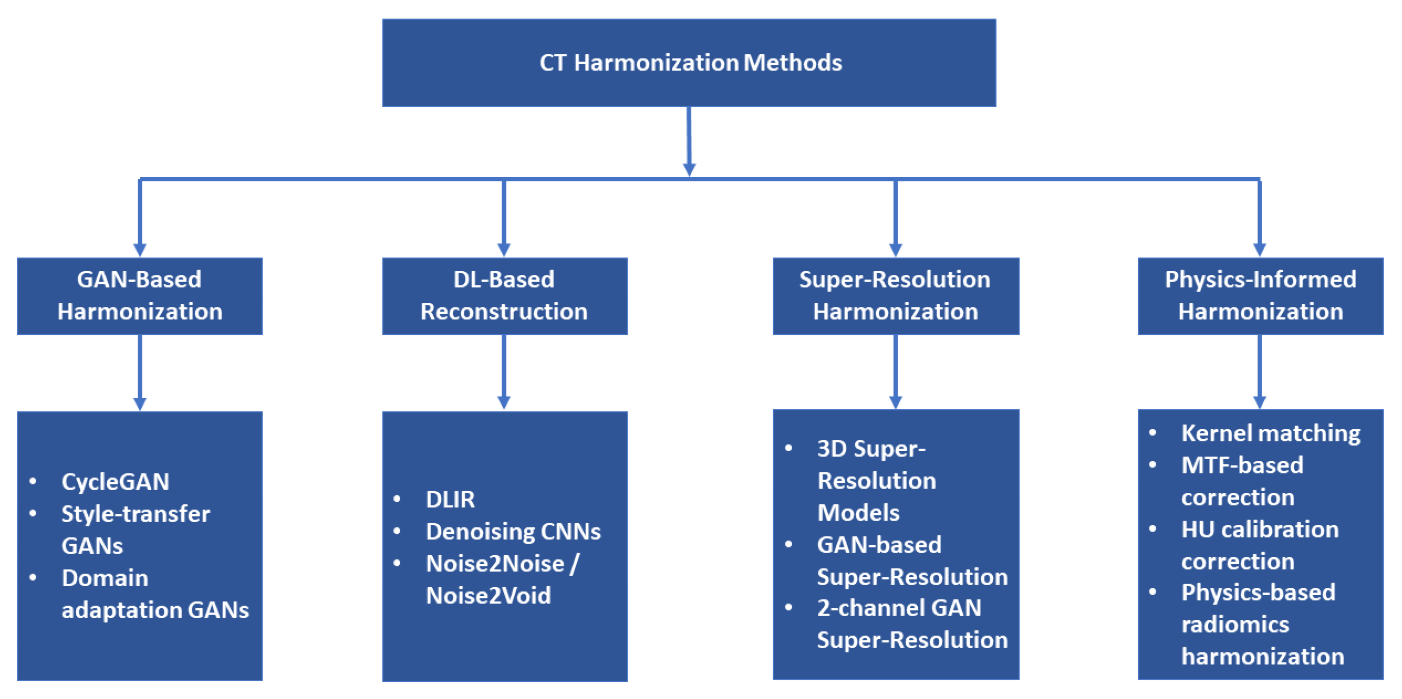 30]. Statistical harmonization techniques including ComBat, Z-score normalization, and histogram matching accounted for 6% of studies and offered strong cross-scanner robustness while maintaining HU fidelity, although they rely on the assumption of consistent batch effects [