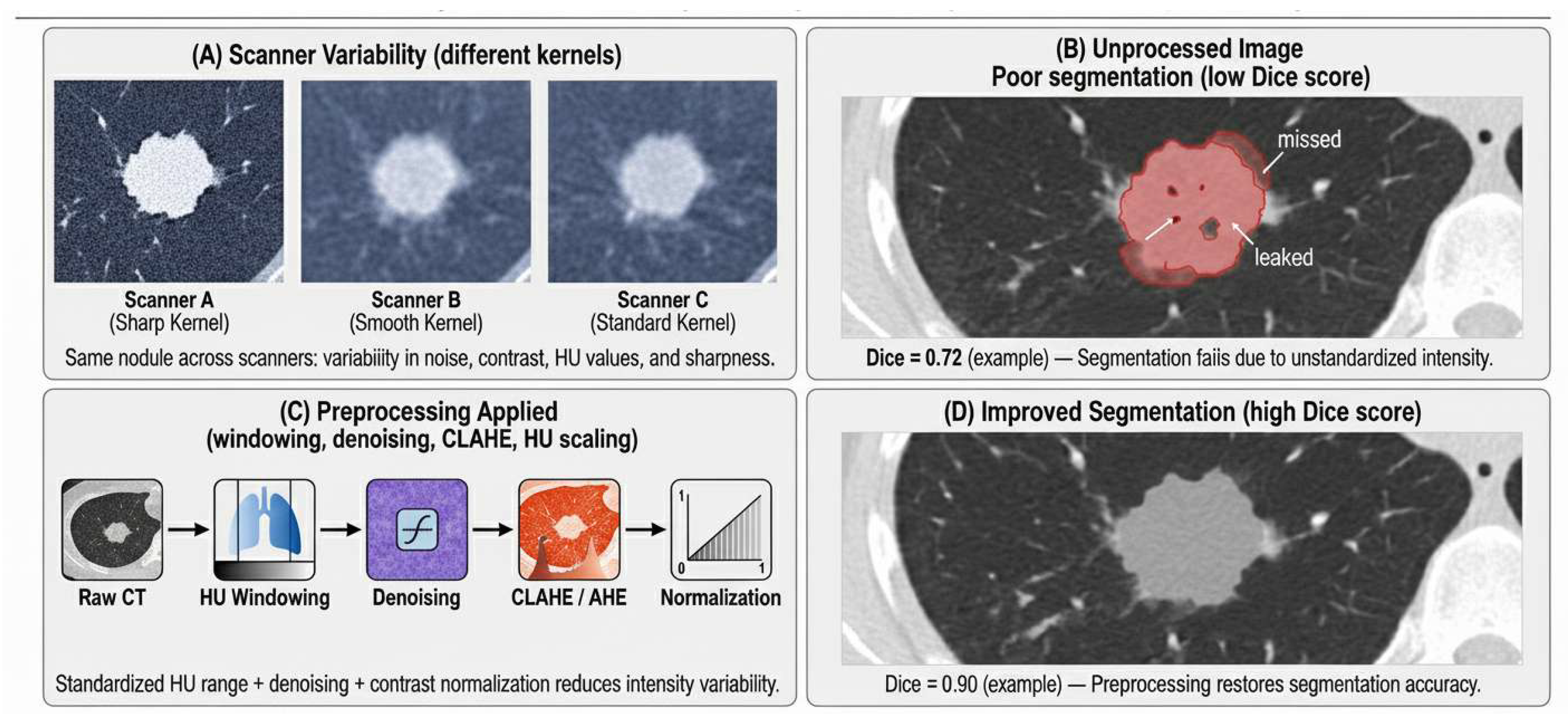 Overall, the findings indicate that achieving clinically reliable and vendor-agnostic lung-CT AI systems requires a unified, HU-faithful preprocessing framework. Such a pipeline should integrate HU-preserving normalization, DLIR or N4ITK-based denoising, kernel-consistent resampling, selective harmonization, and spatial normalization through segmentation [