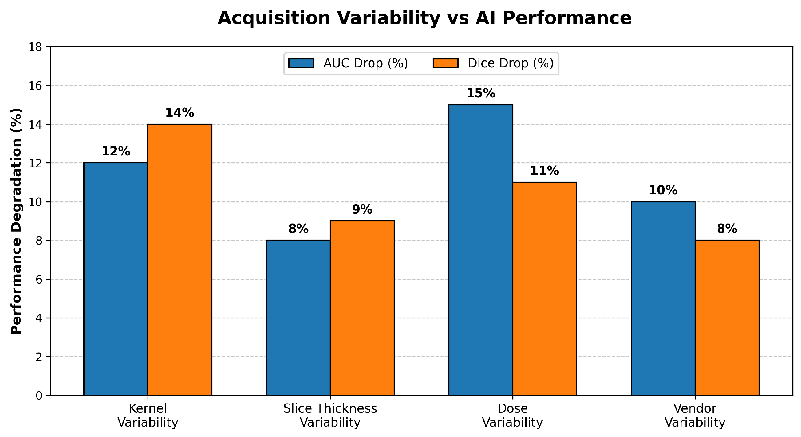 A second limitation is the widespread absence of detailed acquisition metadata in the primary literature. Many studies did not report reconstruction kernels, slice thickness, dose levels, or vendor specifications parameters essential for assessing the true impact of variability on AI robustness [