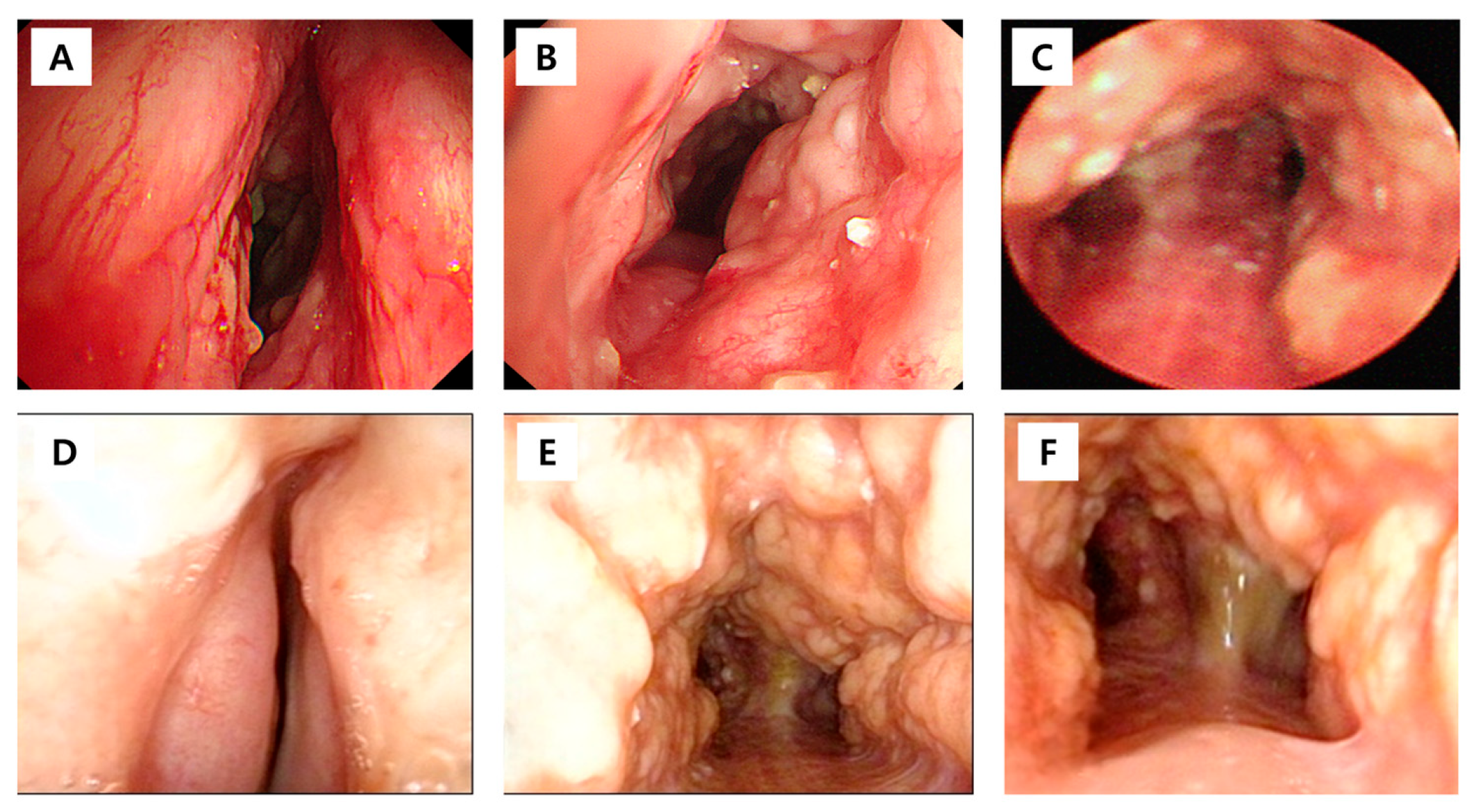 - Garcia, C.A.; Sangiovanni, S.; Zuniga-Restrepo, V.; Morales, E.I.; Sua, L.F.; Fernandez-Trujillo, L. Tracheobronchopathia Osteochondroplastica-Clinical, Radiological, and Endoscopic Correlation: Case Series and Literature Review. J. Investig. Med. High Impact Case Rep. 2020, 8, 2324709620921609. [Google Scholar] [CrossRef]