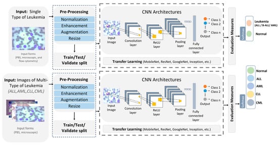 A growing body of work applies DL to diagnose and classify a single leukemia type, highlighting the promise of CNNs, hybrid pipelines, and ensembles in boosting accuracy [4,10,11,12]. Figure 2 illustrates a streamlined single-type versus multiple-type classifiers workflow. The Single-Type and Multiple-Type classifier pipelines are recognized and differentiated based on the number and diversity of leukemia classes targeted and the corresponding network design and labeling strategy.