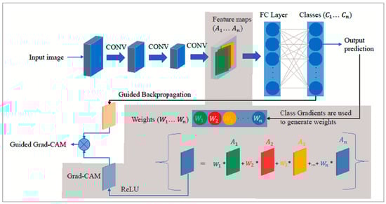 Grad-CAM provides visual explanations for CNN models by leveraging the high-level semantic and spatial information captured by the last CNN layer. Grad-CAM identifies the importance of each neuron for a target class using backpropagated gradients. Gradients for non-target classes are set to zero, and the non-zero signal is backpropagated to generate Rectified Convolutional Feature Maps (RCFM), which are combined to produce the Grad-CAM localization map [2]. Figure 5 shows the Grad-CAM architecture [21]. To generate this map, Grad-CAM calculated the gradient of the target class score