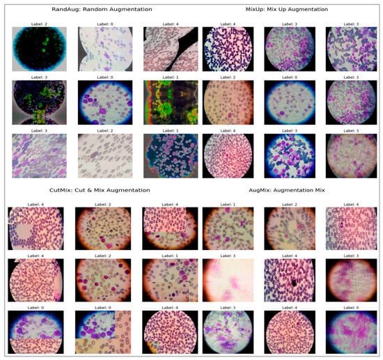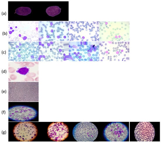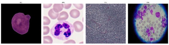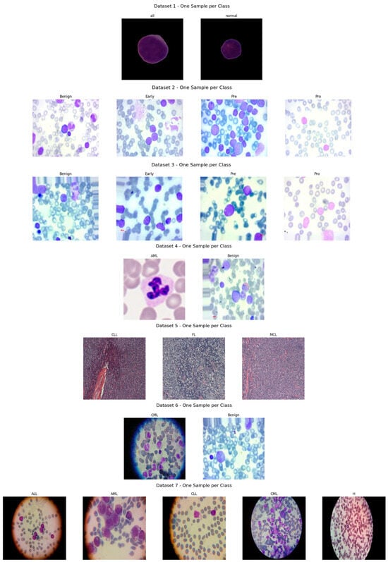To support the experimental evaluation of leukemia diagnosis, we assembled a benchmark corpus by aggregating seven publicly available datasets sourced from Kaggle and Rabinndata. The consolidated dataset integrated seven open repositories (ALL_IDB1–2, C_NMC_Leukemia, MLL, Raabin-WBC, Peripheral_Blood_Cells, BloodMNIST, and BloodCell_Images) comprising 66,550 images. All sets were curated and harmonized to yield consistent annotations that reflect the morphological variability characteristic of distinct leukemia subtypes. The consolidated benchmark encompassed Acute Lymphoblastic Leukemia (ALL), Acute Myeloid Leukemia (AML), Chronic Lymphocytic Leukemia (CLL), and Chronic Myeloid Leukemia (CML), and included healthy controls for the ALL subset, as illustrated in Figure 6. This breadth of material provided a robust foundation for deep learning-based classification and diagnostic modeling. The integrated collection comprised 15,135 microscopic images covering ALL and healthy cells, as well as 3256 peripheral blood smear (PBS) images labeled as benign or malignant. Malignant ALL cases were further stratified into Early Pre-B, Pre-B, and Pro-B to capture lymphoblast progression. An additional 20,000 ALL images—drawn from a larger archive of approximately 130,000 cancer images—were categorized into benign versus malignant. For AML, we included 10,000 PBS images capturing hallmark myeloid morphology. The CLL component consisted of two subsets totaling 113 images extracted from malignant lymphoma material. The CML portion comprised 623 microscope images acquired via a smartphone camera, providing high-detail morphology for chronic myeloid analysis. Finally, a comprehensive dataset spanning all four leukemia types plus healthy cells contributed 20,000 microscopic images covering ALL, AML, CLL, CML, and H (healthy). The ALL subset was hierarchically annotated to mirror disease trajectory: Benign denoted non-cancerous healthy cells (specific to the ALL collection), Early marked incipient leukemic presentation, Pre indicated pre-stage abnormalities suggestive of progression, and Pro represented advanced-stage leukemia cells. Across the corpus, imaging conditions varied in resolution, magnification, and clinical context. A full specification of sources, class labels, and counts is provided in Table 4.