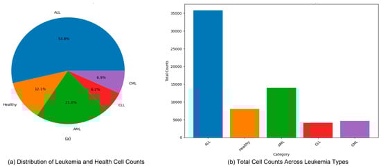 Distribution and total cell counts of leukemia types (ALL, AML, CLL, and CML) in the dataset (a) Distribution of Leukemia and Health Cell Counts, (b) Total Cell Counts Across Leukemia Types.