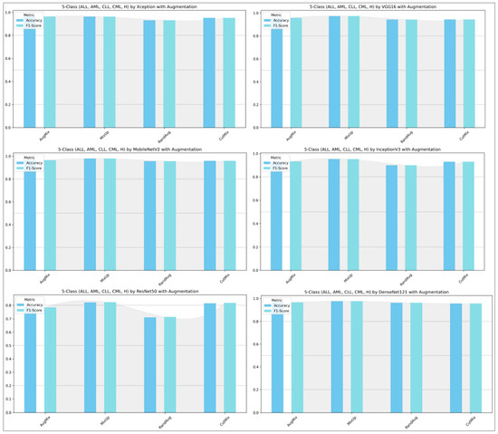 Figure 13 and Figure 14 show that augmentation choice and backbone architecture jointly govern performance. For ALL-subtype recognition (Figure 13), most pretrained models approach ceiling performance, with MixUp typically yielding the highest accuracy/F1 and AugMix close behind; RandAug is consistently weakest, and CutMix is competitive but rarely best. DenseNet121 and MobileNetV2 are the most robust, while ResNet50 exhibits the largest drop and variability. In the harder five-class setting (Figure 14), absolute scores decline slightly across models, yet the pattern persists: MixUp again dominates (especially for MobileNetV2 and DenseNet121), AugMix remains a reliable second, and RandAug trails. Notably, accuracy and F1 move in lockstep, indicating balanced precision–recall, with the biggest architecture gap seen for ResNet50 versus the stronger DenseNet121/MobileNetV2 pair.