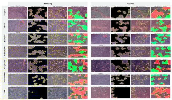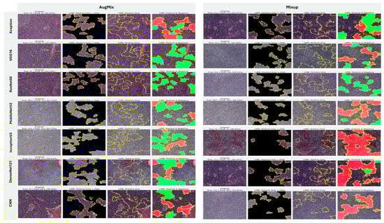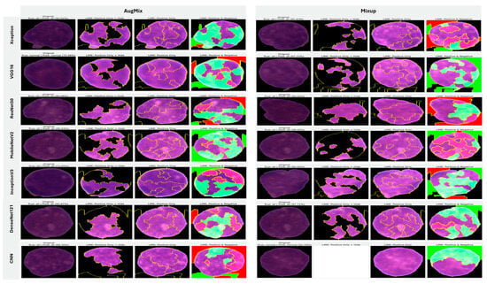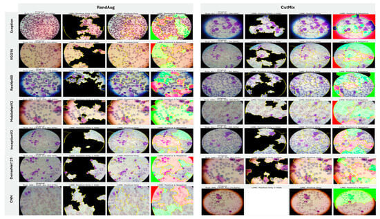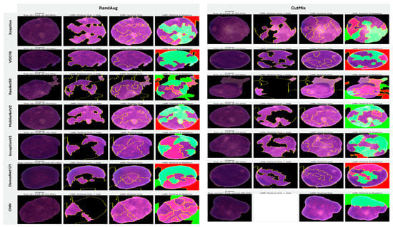 Taken together, these results show a clear contrast between augmentation strategies: MixUp (and, secondarily, CutMix) tends to yield anatomically plausible, nucleus-focused attributions that track improvements in F1, whereas RandAug often produces overconfident yet poorly localized explanations. Notably, high accuracy does not invariably guarantee faithful localization (custom CNN, InceptionV3), underscoring the necessity of multi-view LIME diagnostics to validate decision reliability beyond aggregate performance metrics (Figure 15).