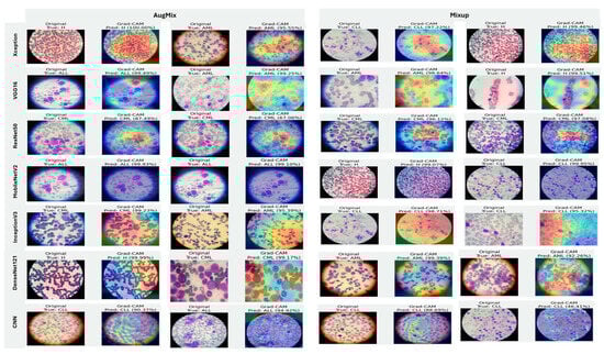 Figure 20, Figure 21 and Figure 22 summarize Grad-CAM evidence across the three multi-class settings and reveal a consistent link between performance and interpretability. In the lymphoma triplet (CLL–FL–CML, shown in Figure 20), saliency is comparatively diffuse and sometimes edge-biased, especially for ResNet50 and the custom CNN—reflecting the task’s higher class similarity; MixUp generally sharpens attention over subtype-relevant tissue regions, with DenseNet121 and InceptionV3 producing the most coherent maps. In contrast, ALL-subtype recognition (Benign, Early, Pre, and Pro; Figure 21) yields compact, nucleus-centric activations across backbones, with MixUp (and closely, AugMix) focusing on diagnostically meaningful structures; DenseNet121 and MobileNetV2 are particularly well localized, whereas ResNet50 and the CNN remain less stable. The five-class setting (ALL, AML, CLL, CML, and Healthy; Figure 22) falls between these extremes: MixUp again delivers the cleanest, class-specific attributions for DenseNet121, MobileNetV2, Xception, and VGG16, while weaker models exhibit broader, less discriminative heatmaps.