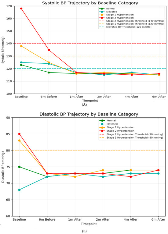 A significant difference in baseline SBP was observed among classification groups (Figure 2A). After one month post-intervention, all groups achieved systolic blood pressure readings between 115 and 117 mmHg, which is well below the criterion for hypertension (120 mmHg). This alignment continued during the follow-up period, indicating significant reductions from baseline for hypertensive groups (−52 mmHg for Stage 2), (−22 mmHg for Stage 1). Similarly, baseline DBP values indicated classification categories (Figure 2B). After the intervention, all groups maintained DBP between 71 and 74 mmHg throughout the 6-month follow-up, indicating continuous decreases for hypertensive groups (−11 mmHg for Stage 2, −9 mmHg for Stage 1). Additionally, blood pressure values during the 6-month usual care period were obtained retrospectively from hospital records, and the number and timing of measurements varied among patients. Across the available recordings, mean systolic blood pressure (SBP) was 125 ± 15 mmHg six months prior to the intervention and 140 ± 34 mmHg immediately before the intervention. These findings indicate that some patients already presented with elevated SBP just before entering the digital intervention program.