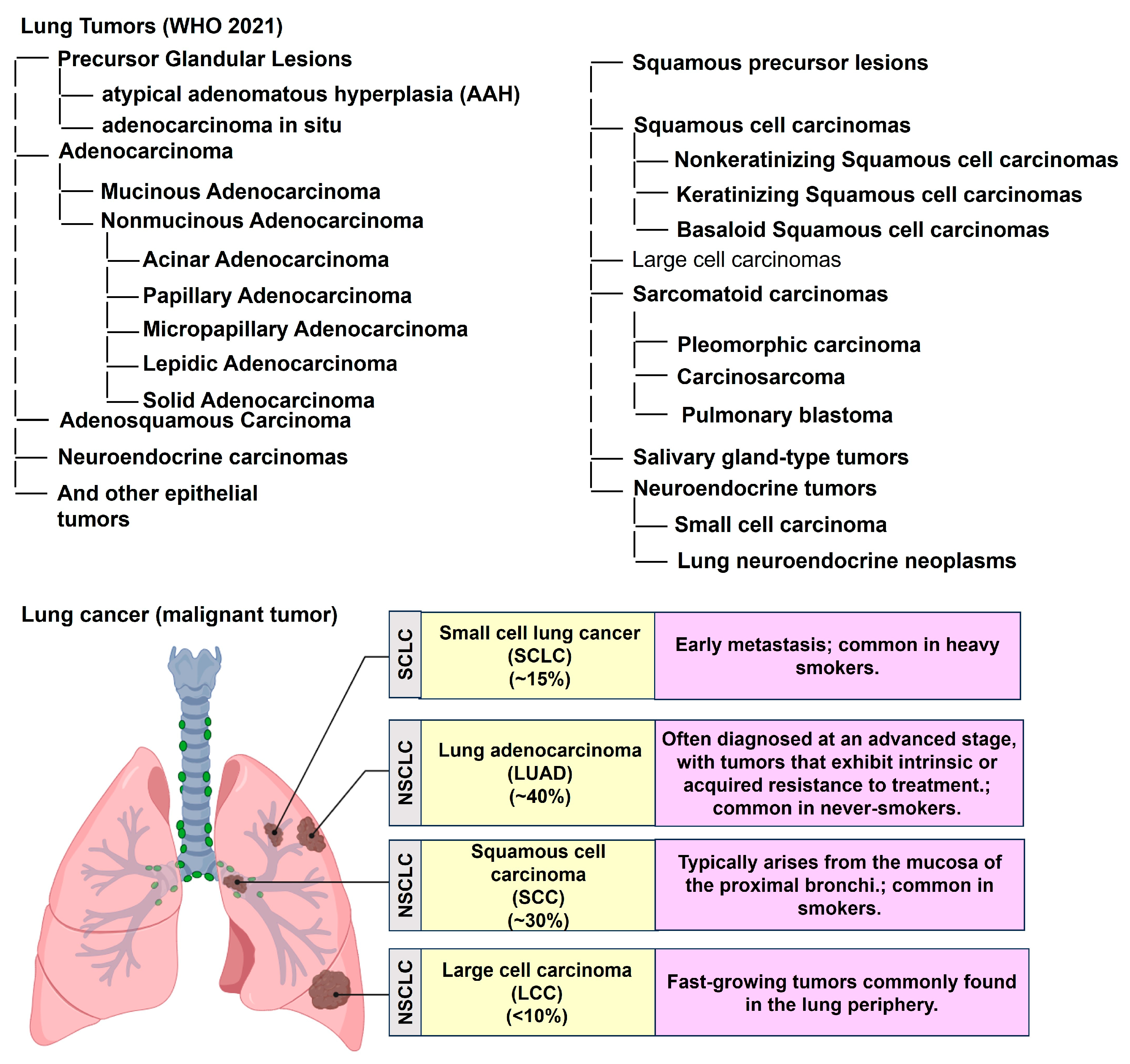 | Common Genetic Drivers | EGFR, PIK3CA, OS9, MET, and STK11 | TP53 |
