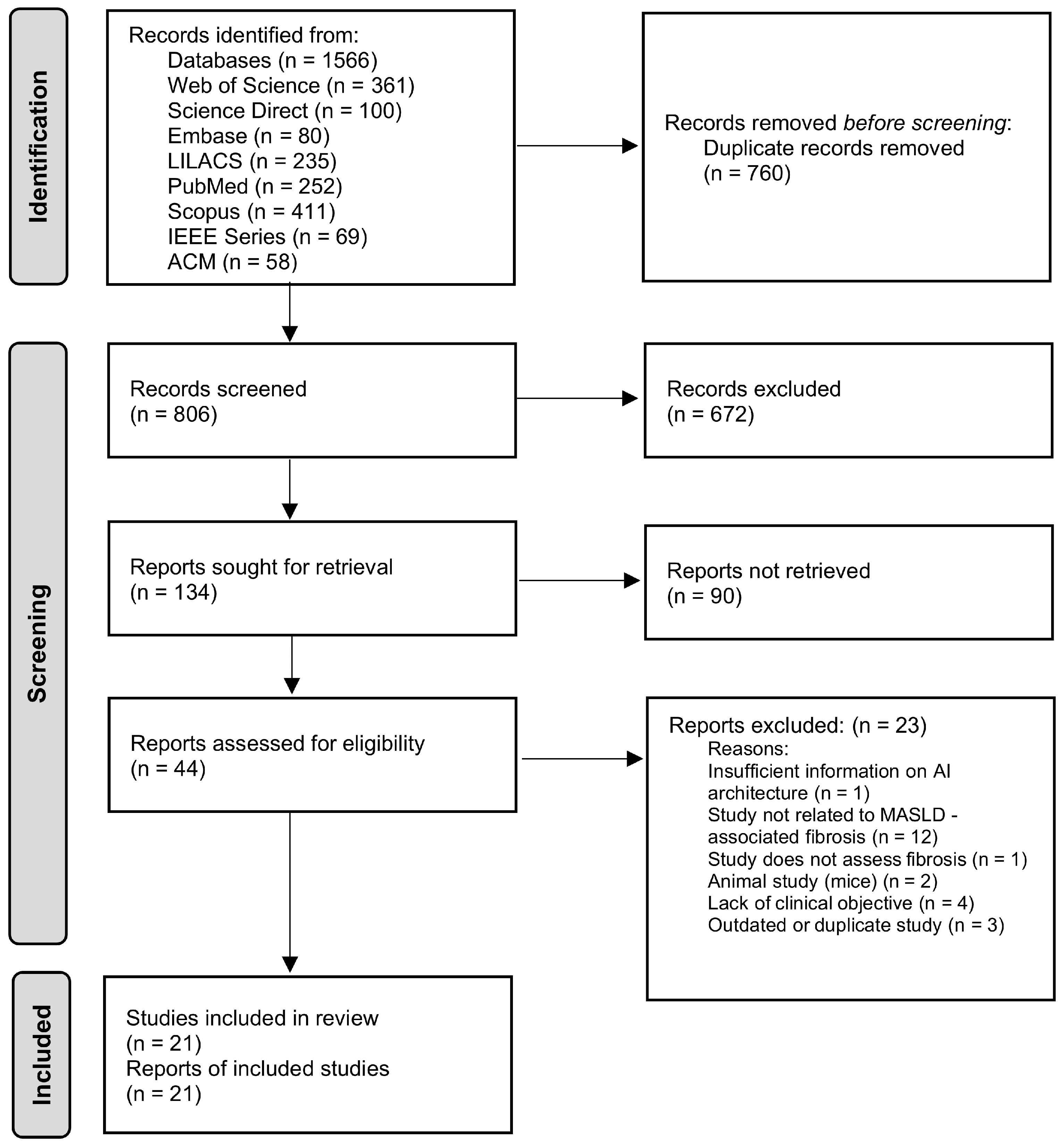 | Comparator | Studies with or without a comparator group. When present, comparisons with traditional methods (e.g., elastography, biopsy, clinical scores) | Studies that only describe imaging methods or laboratory tests without a link to AI |