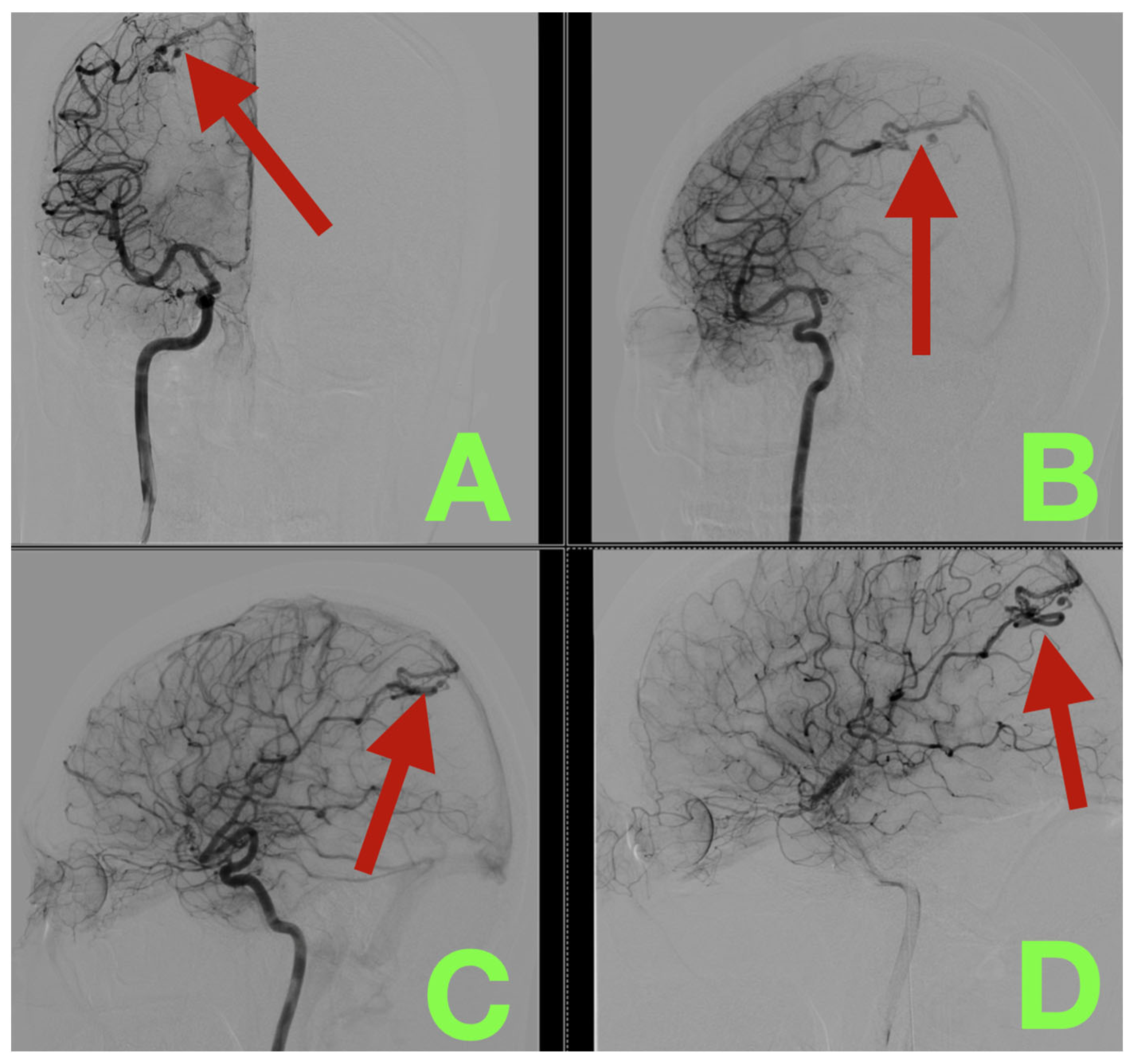 - Mansour, M.A.; Malaeb, R.W.; Mostafa, H.N.; Kamal, M.I.; Ayoub, B. Diagnostic and Therapeutic Dilemmas of Asymptomatic Intracranial AVMs: A Case Report and Evidence-Based Review. Radiol. Case Rep. 2024, 19, 6452–6459. [Google Scholar] [CrossRef]