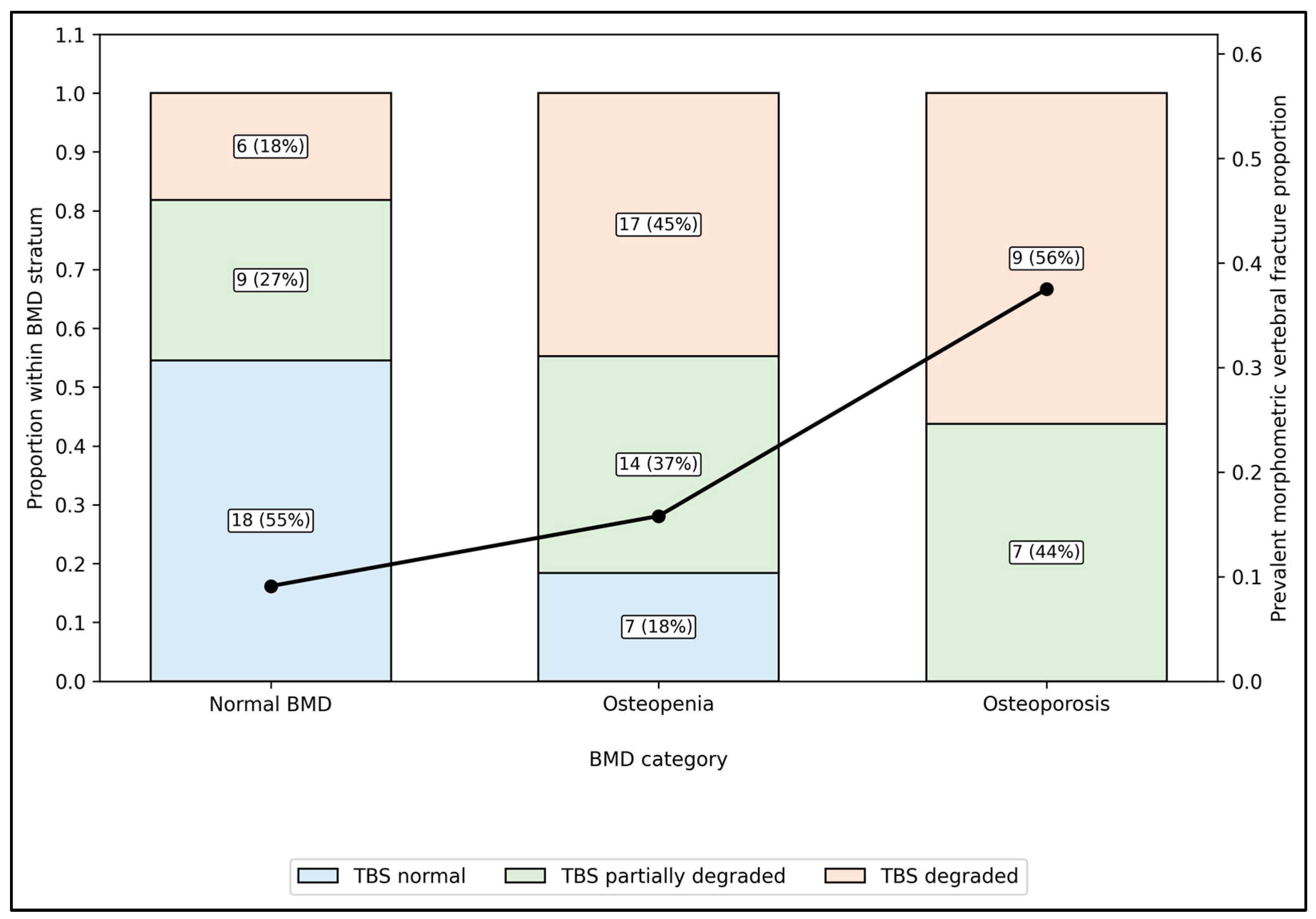 | Normal BMD | 33 | 18 (55) | 9 (27) | 6 (18) | 3 (9) |
