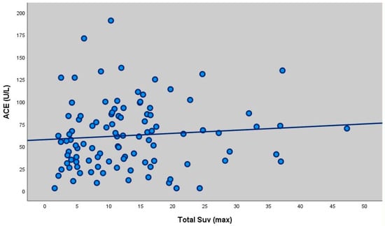 When ACE levels were compared with PET/CT results, no significant correlation was found with parenchymal or lymph node SUVmax values. However, a weak but significant positive correlation was observed between total SUVmax and ACE levels (p = 0.019), suggesting that higher ACE levels may be associated with greater overall inflammatory metabolic intensity. This finding contrasts with previous reports [12,21] that reported no association between SUVmax values and biochemical markers of disease activity.
