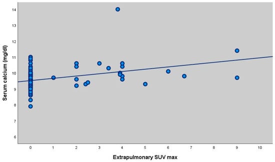 Scatter plot showing the correlation between serum calcium levels and extrapulmonary SUVmax (r = 0.327, p = 0.001).
