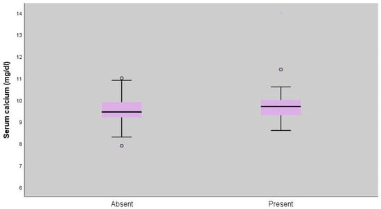 Serum calcium values of the participants ranged between 7.9 and 14, and the mean value was 9.62 ± 0.67 mg/dL.