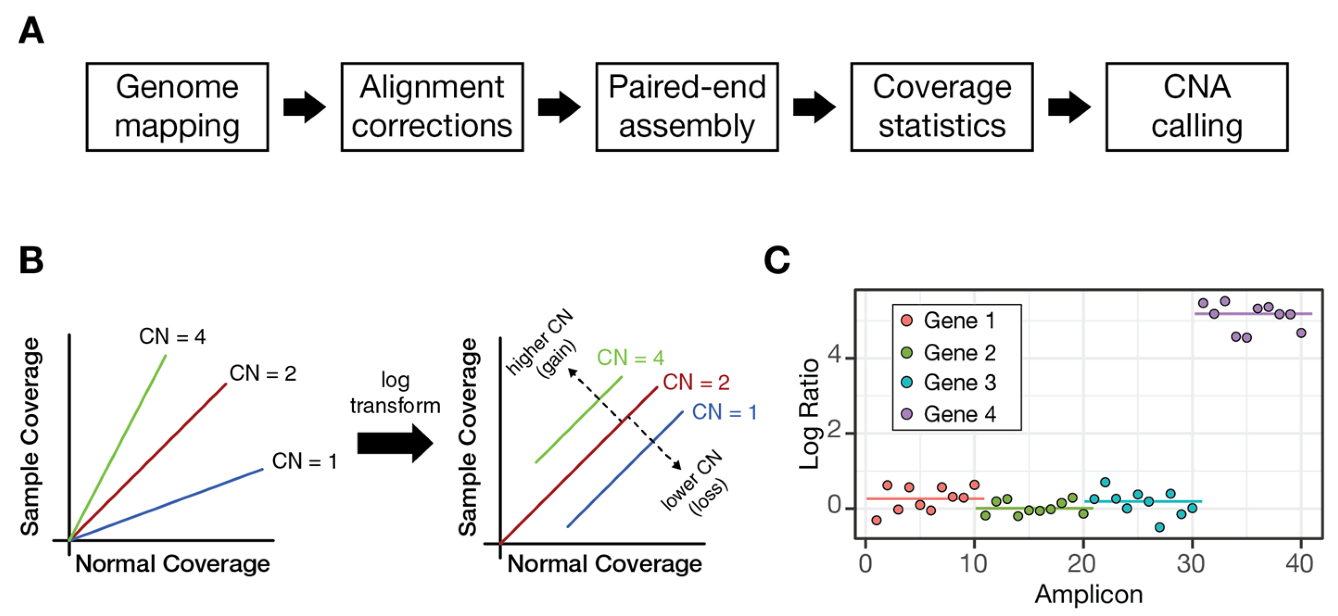 - Linearity of read counts. Expected read counts scale approximately linearly with copy number. For example, a locus present at four copies yields, on average, twice as many reads as a locus with two copies.