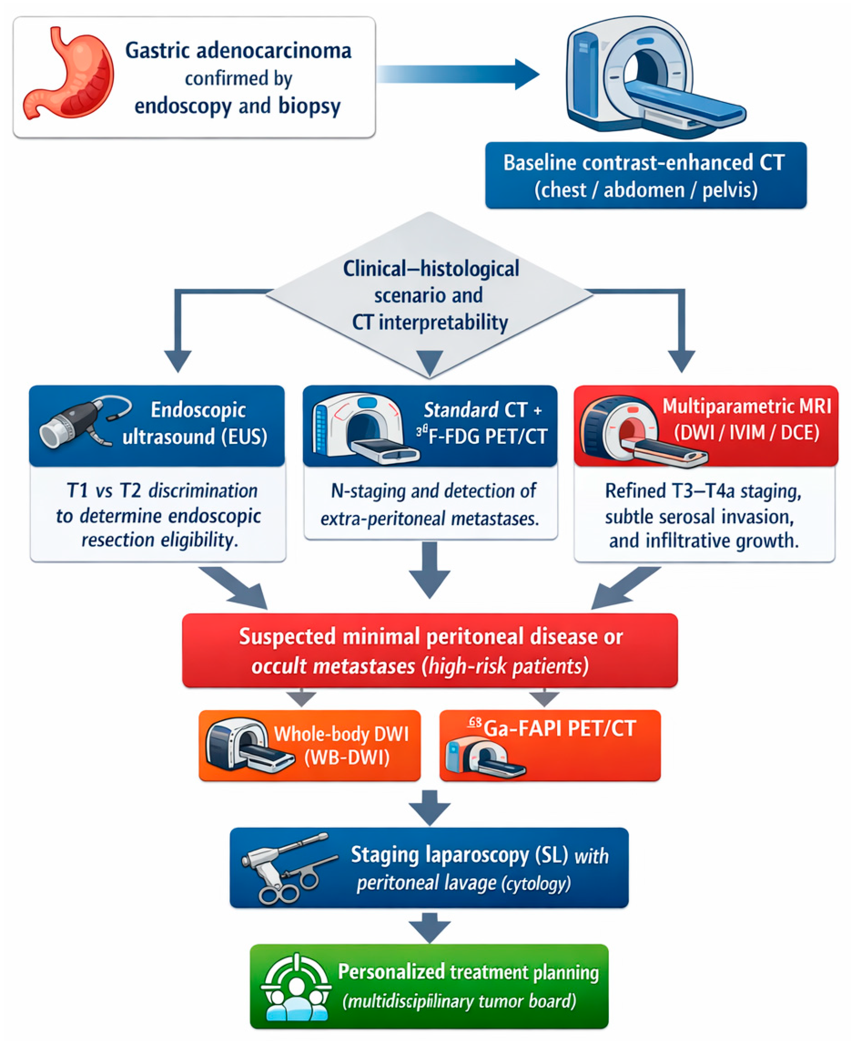 | FAPI PET | Higher uptake than FDG in low-uptake and stroma-rich tumors and an emerging role in staging, particularly for diffuse gastric cancer | Evidence is still preliminary, with limited availability and lack of long-term outcome data |