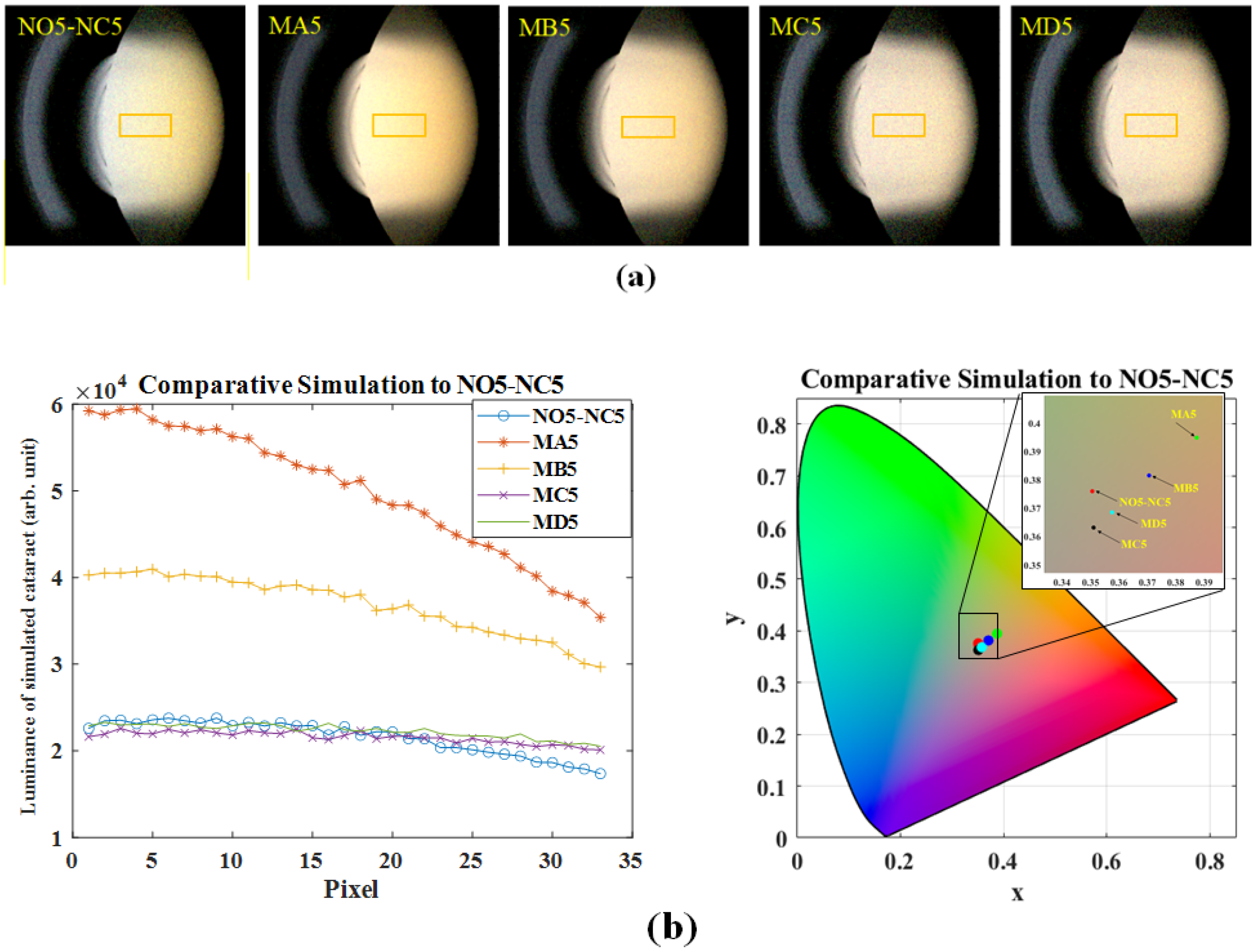 Figure 4a. The ROI in each photo is marked out by a yellow rectangle. The luminance distribution along the visual axis and average chromaticity in the ROI are shown in