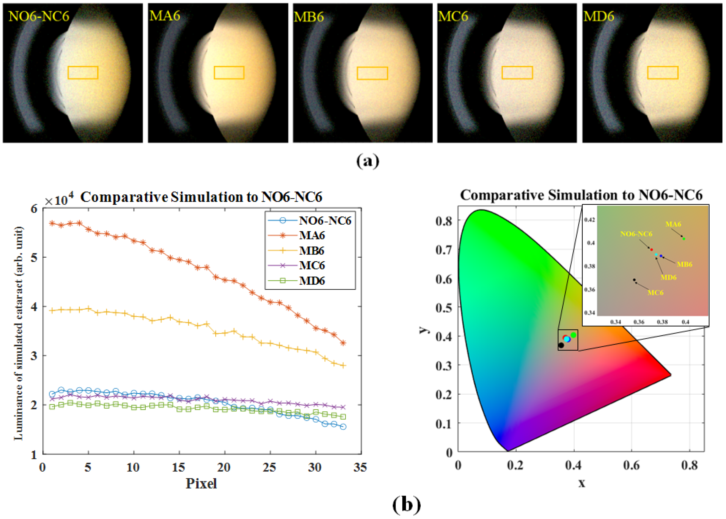 12]. Furthermore, the monotonic changes in luminance and chromaticity from NO1-NC1 to NO6-NC6 are consistent with the conceptual distinction between functional visual degradation dominated by forward scattering and slit-lamp appearance dominated by backward scattering [