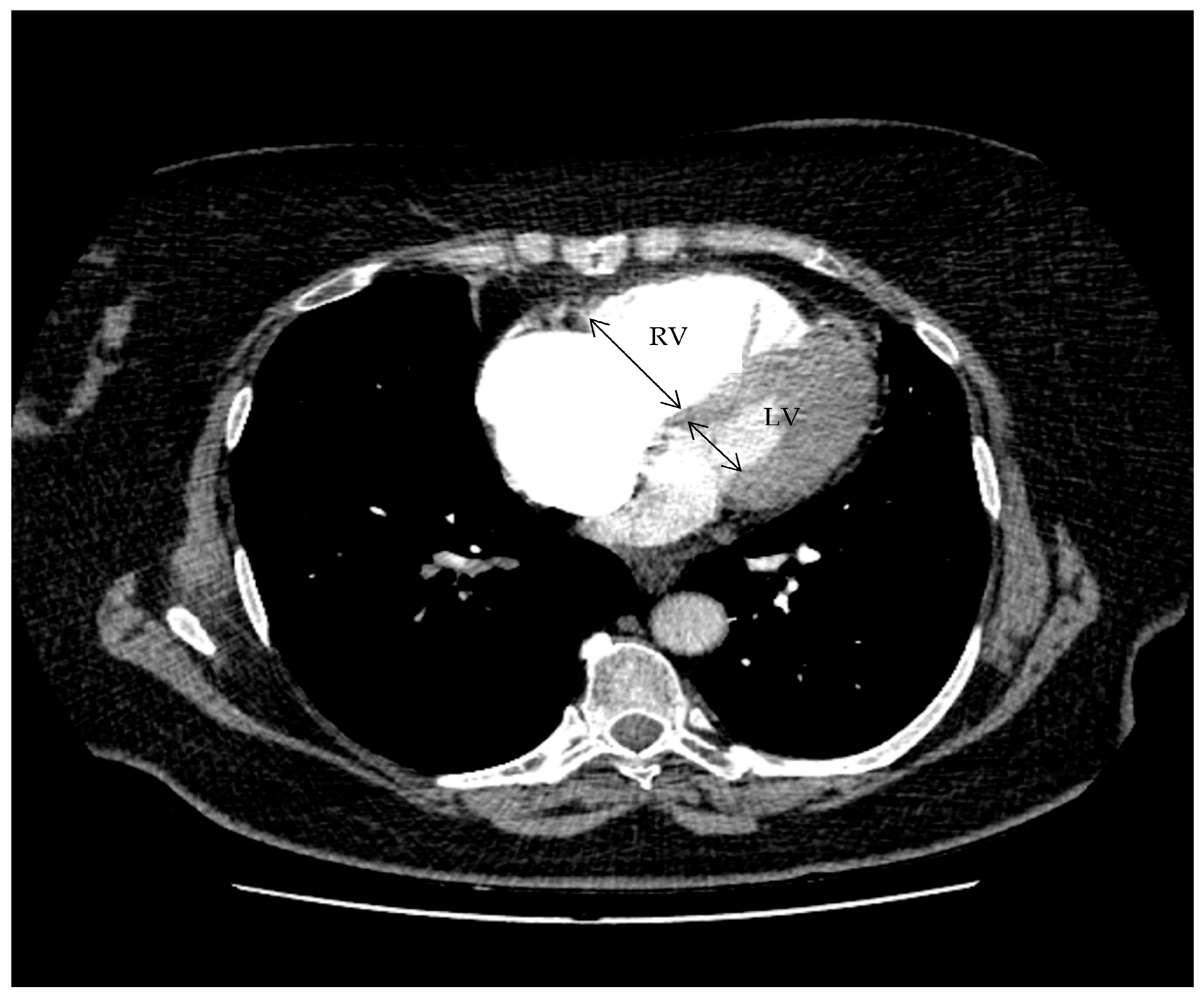- Kang, D.K.; Thilo, C.; Schoepf, U.J.; Barraza, J.M.; Nance, J.W.; Bastarrika, G.; Abro, J.A.; Ravenel, J.G.; Costello, P.; Goldhaber, S.Z. CT Signs of Right Ventricular Dysfunction. JACC Cardiovasc. Imaging 2011, 4, 841–849. [Google Scholar] [CrossRef]