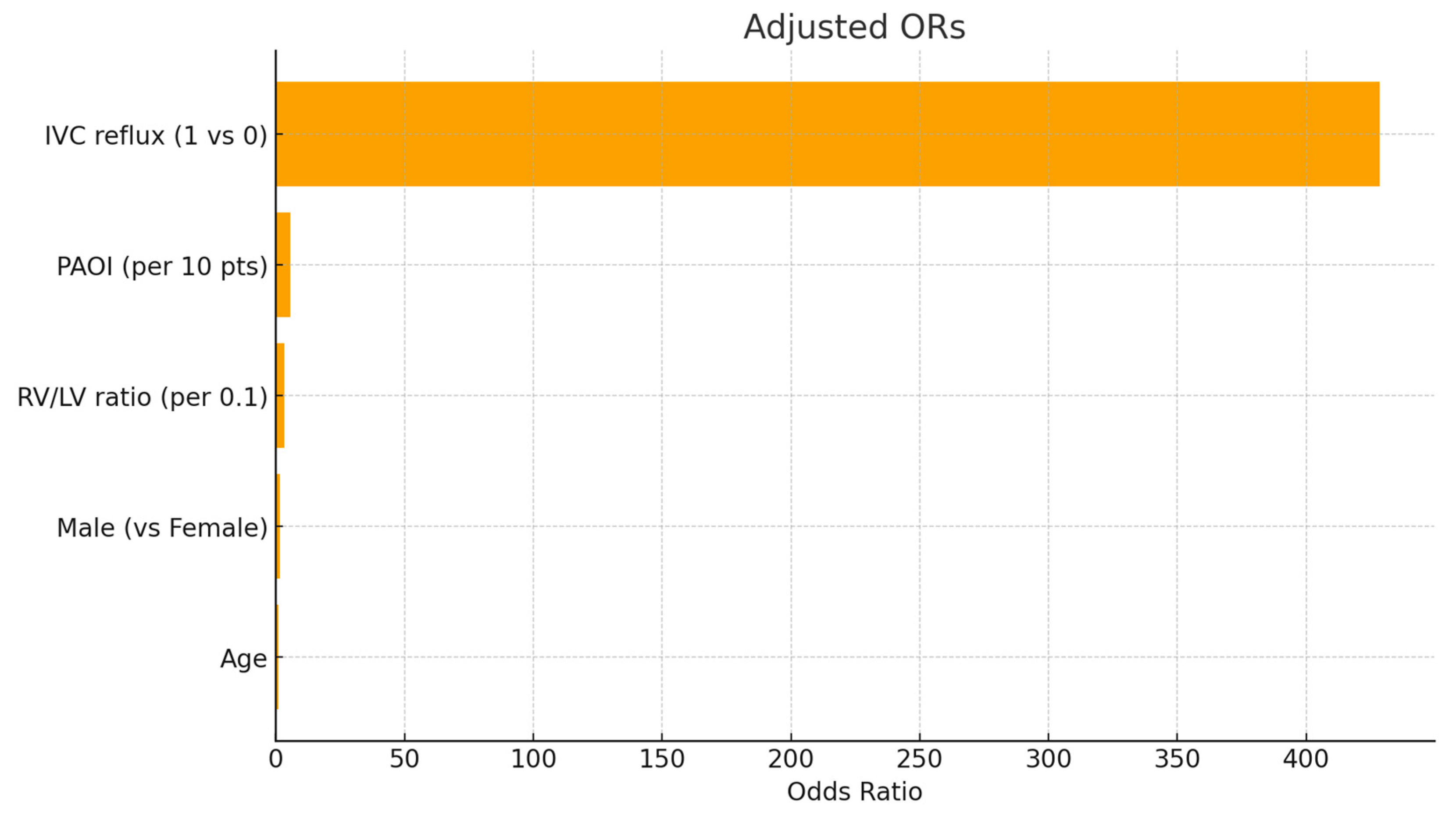 Figure 2 depicts the adjusted odds ratios with 95% confidence intervals for the main CT-derived predictors of in-hospital adverse events: RV/LV ratio (per 0.1 increase), PAOI (per 10-point increase), and the presence of IVC reflux. The effect sizes are shown on a logarithmic scale, visually demonstrating that IVC reflux is the strongest independent predictor, followed by PAOI and RV/LV ratio.