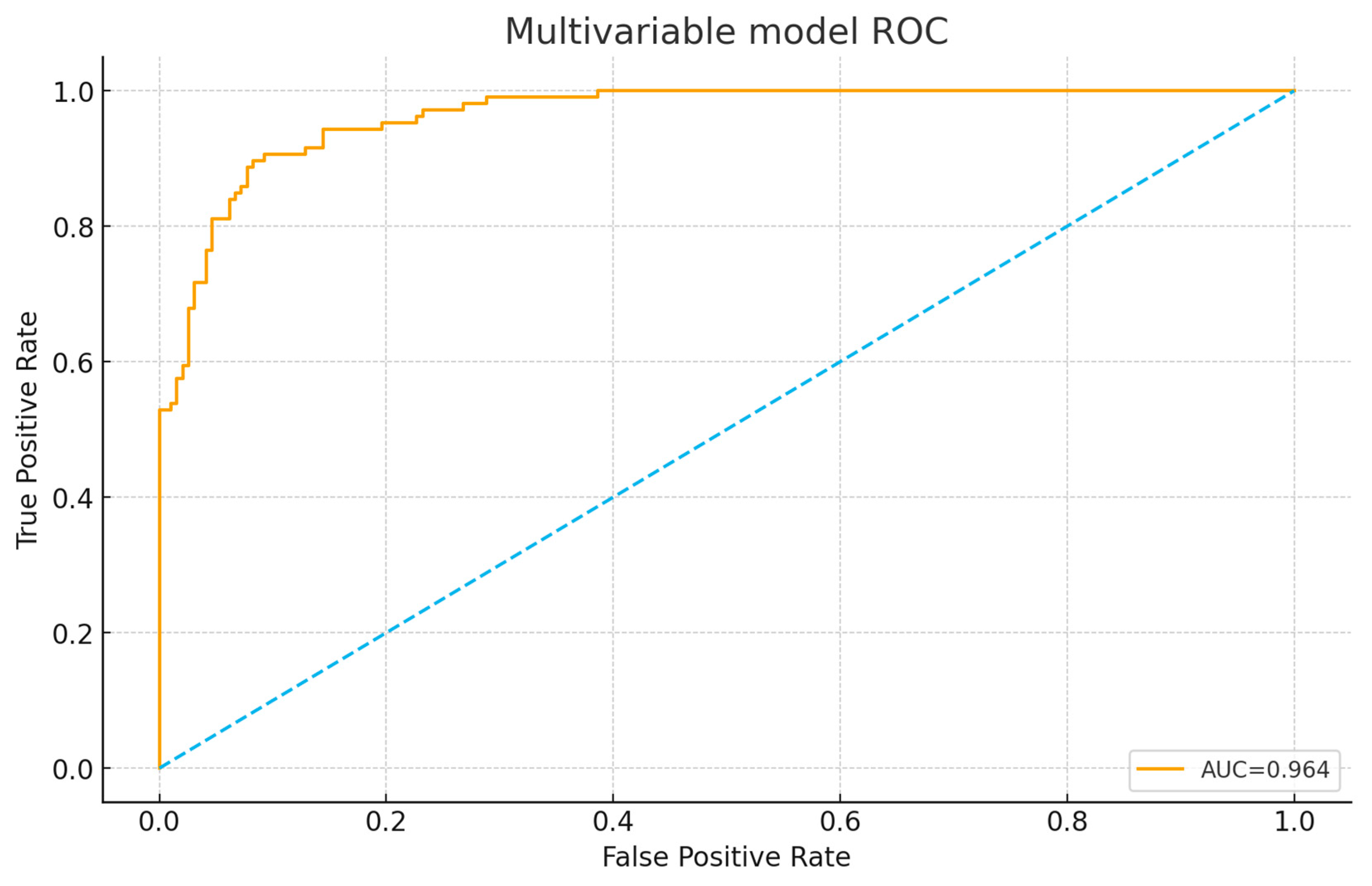 Figure 3 presents the receiver operating characteristic (ROC) curve for the multivariable prognostic model combining RV/LV ratio, PAOI, and IVC reflux. The curve demonstrates excellent discrimination, with an area under the curve (AUC) of 0.964.