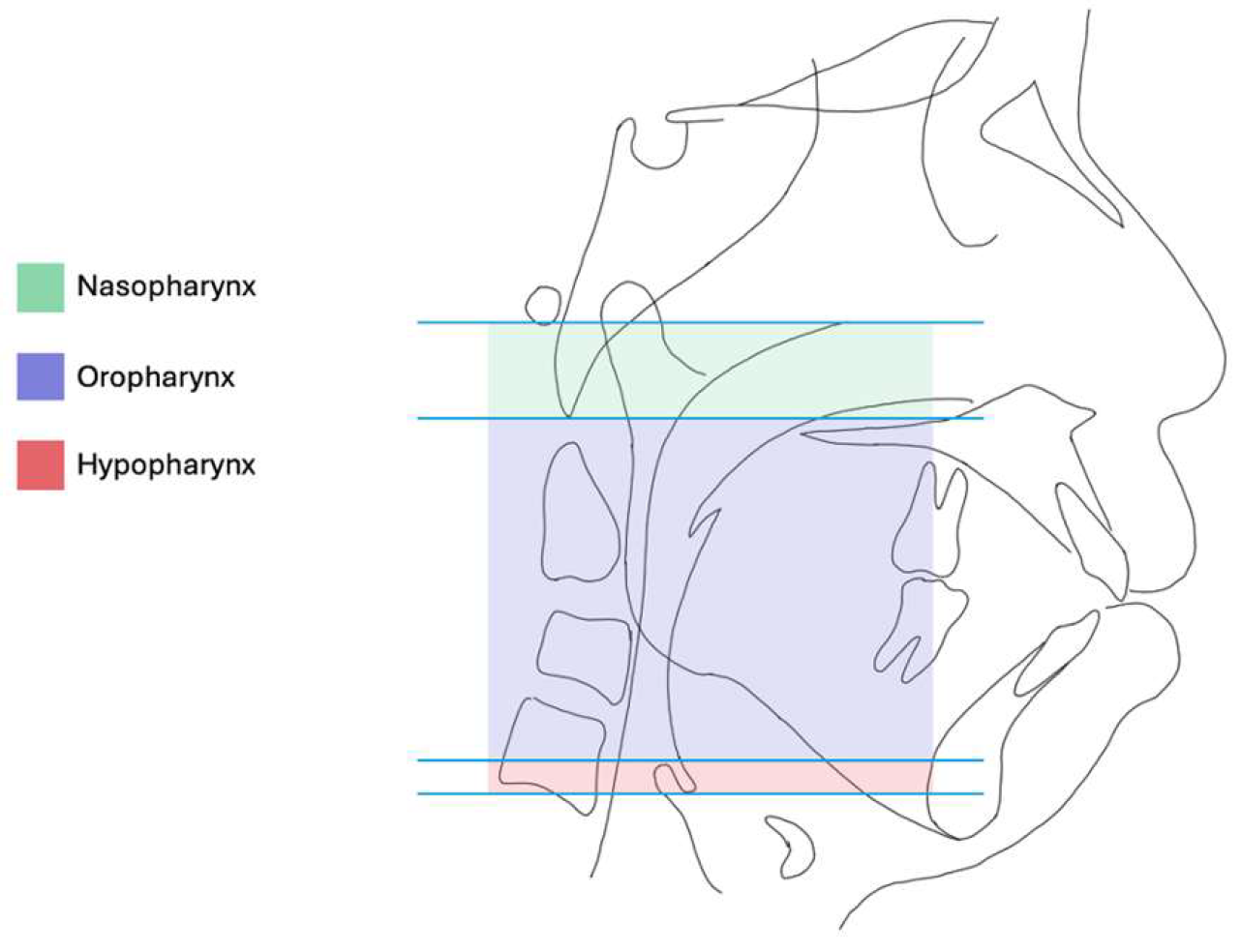 | Inferior border of oropharynx, or superior border of hypopharynx | Horizontal plane at the lowest anterior point of C2 Horizontal plane at the lowest anterior point of C3 Horizontal plane at the tip of the epiglottis Horizontal plane at the base of the epiglottis (vallecula) Plane connecting the lowest anterior point of C3 to the menton (Me) Plane connecting the highest anterior point of C4 to the menton (Me) |