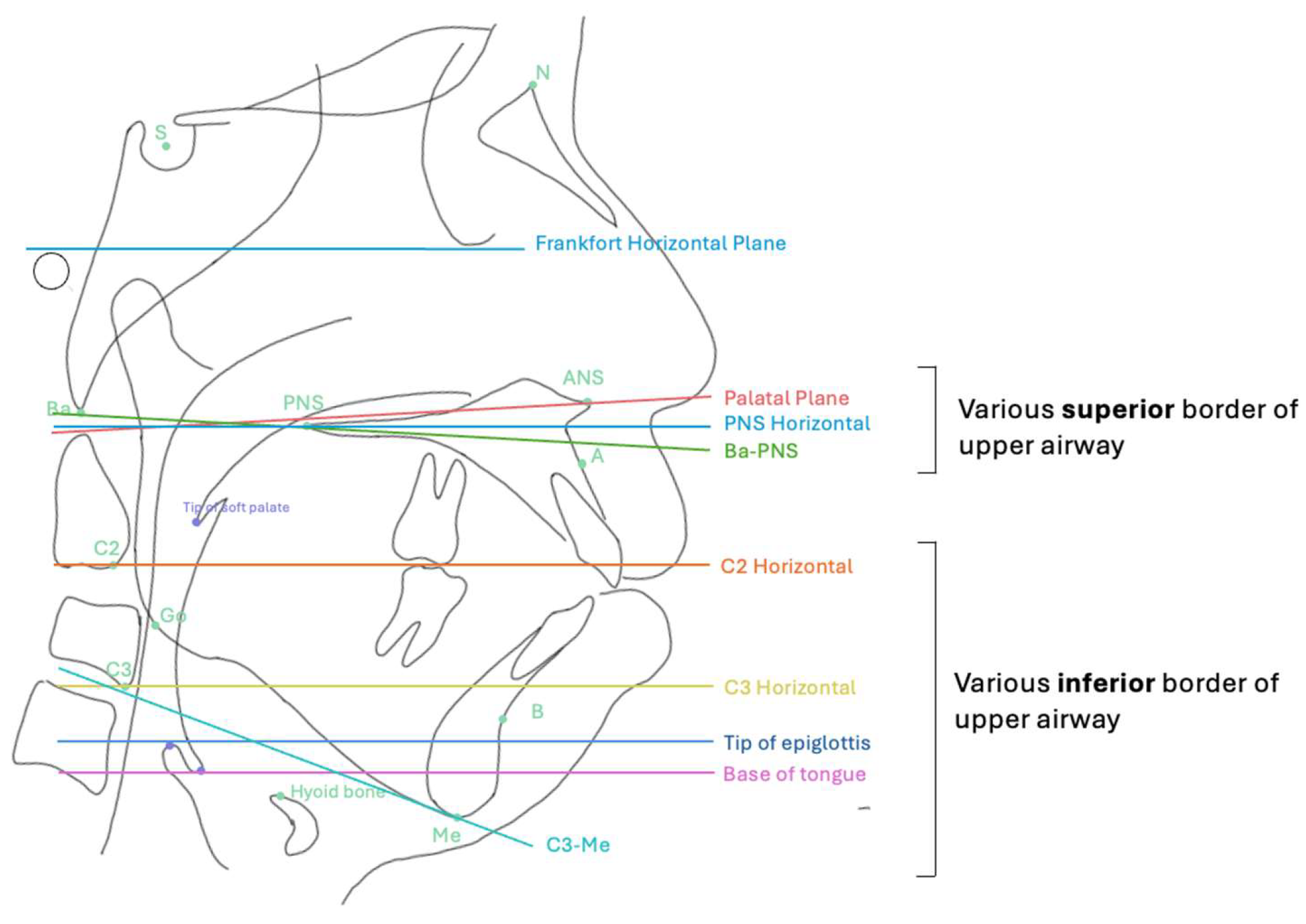 | Inferior border of nasopharynx, or superior border of oropharynx | Palatal Plane (ANS—PNS) Horizontal Plane through PNS Plane connecting the odontoid apex to the PNS Ba-PNS Plane |
