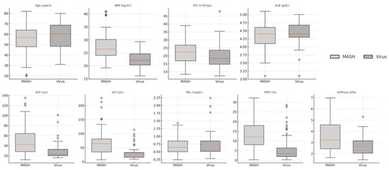 A direct comparison of baseline characteristics between MASH and Virus groups is presented in Figure 3. Patients with viral hepatitis tended to be older, had lower BMI and PDFF, and showed higher liver stiffness, supporting divergent clinical profiles by etiology.