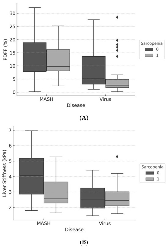 (A) PDFF by disease etiology and sarcopenia status. Boxplots comparing hepatic fat content (proton density fat fraction; PDFF) between patients with and without sarcopenia in each disease group (MASH and viral hepatitis). Sarcopenic patients with MASH showed significantly lower PDFF values compared to non-sarcopenic counterparts, suggesting energy substrate depletion. (B). Liver stiffness by disease etiology and sarcopenia status. Boxplots showing liver stiffness measurements (kPa) in patients stratified by sarcopenia status and disease etiology. In viral hepatitis, liver stiffness tended to be higher in sarcopenic patients, consistent with advanced fibrosis.
