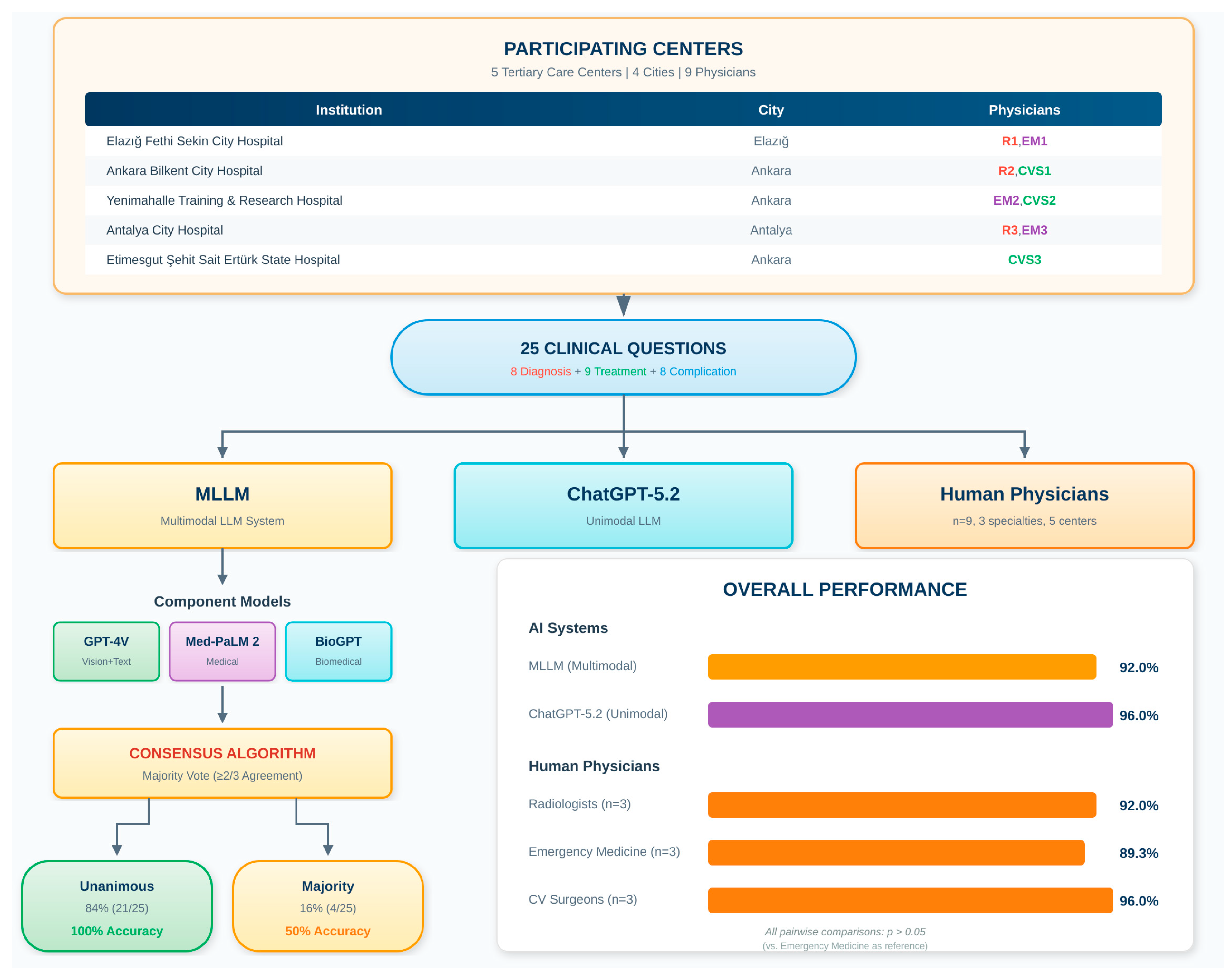 This multicenter study endeavors to compare the performance of a combined MLLM system, a unimodal LLM (ChatGPT-5.2), and human clinical experts from five tertiary care centers across Turkey—radiologists, emergency medicine specialists, and cardiovascular surgeons—on identical clinical questions pertaining to aortic dissection. Performance assessment was conducted across three clinical domains: diagnosis, treatment, and management of complications.