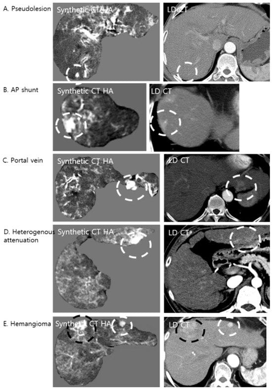 Examples of false-positive lesions on Synthetic CTHA. The algorithm may enhance non-tumorous structures, mimicking hypervascular nodules. The white dashed circles indicate pseudolesions, while the black dashed circles indicate the confirmed hypervascular hepatocellular carcinoma (HCC) lesions. (A) A pseudolesion generated in the absence of any enhancing structure on LDCT. (B) An arterioportal (AP) shunt showing early enhancement is accentuated, appearing nodular. (C) A cross-section of a portal vein mimicking a nodule. (D) Focal heterogeneous liver attenuation amplified by the model. (E) A flash-filling hemangioma showing enhancement patterns similar to HCC on the synthetic image.