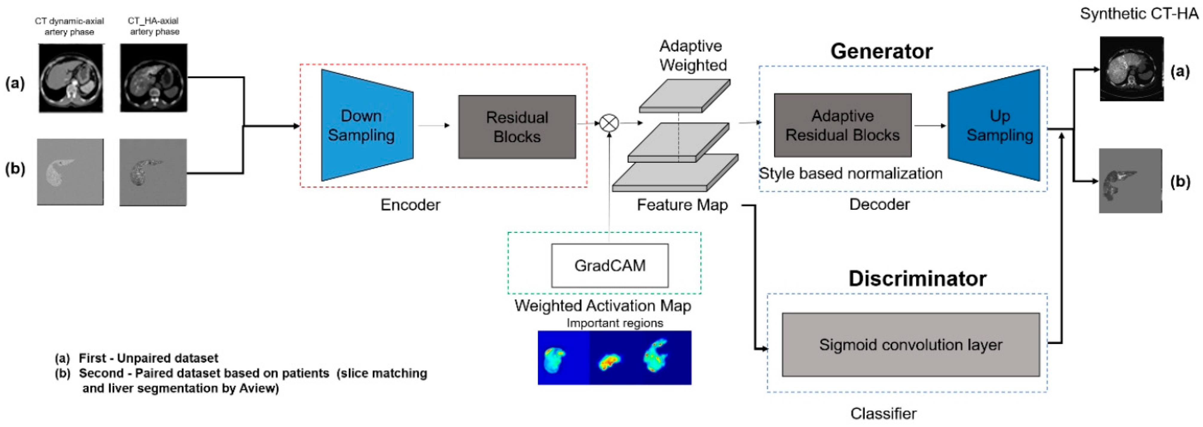 First, the model integrates an auxiliary classifier that generates class activation maps. These maps explicitly highlight discriminative regions, specifically hypervascular HCC lesions, allowing the generator to focus on enhancing these pathological features rather than on irrelevant background textures. Second, Adaptive Layer-Instance Normalization (AdaLIN) dynamically regulates the parameters between Layer and Instance Normalization. This mechanism enables the model to flexibly control the degree of shape and texture translation, thereby preventing excessive “style transfer” that could compromise the anatomical integrity of the liver parenchyma.