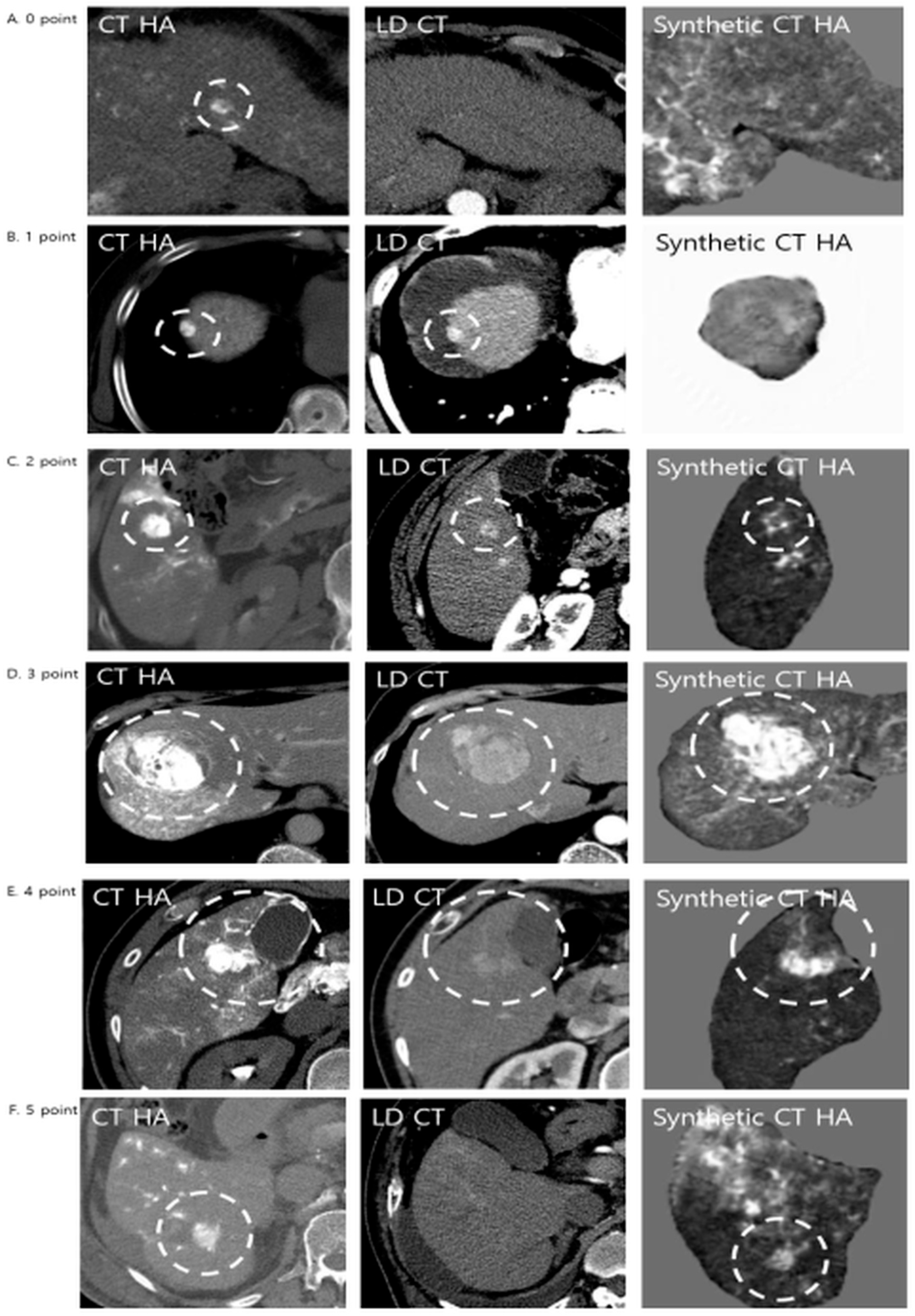 Representative examples of diagnostic performance comparing LDCT and Synthetic CTHA. Lesions were evaluated using a 5-point diagnostic value score. The white dashed circles indicate the hypervascular lesions. (A) Score 0: The lesion is invisible on both LDCT and Synthetic CTHA. (B) Score 1: The lesion is clearly visible on LDCT but lost on Synthetic CTHA (inferior). (C) Score 2: The lesion is visible on Synthetic CTHA but with inferior quality compared to LDCT. (D) Score 3: The lesion shows equivalent conspicuity on both modalities. (E) Score 4 (Superior): The lesion is visible on LDCT, but Synthetic CTHA shows it more clearly with higher contrast. (F) Score 5 (Significantly Superior): The lesion is subtle or invisible on LDCT but is clearly visualized on Synthetic CTHA, demonstrating the potential for detecting occult HCCs.