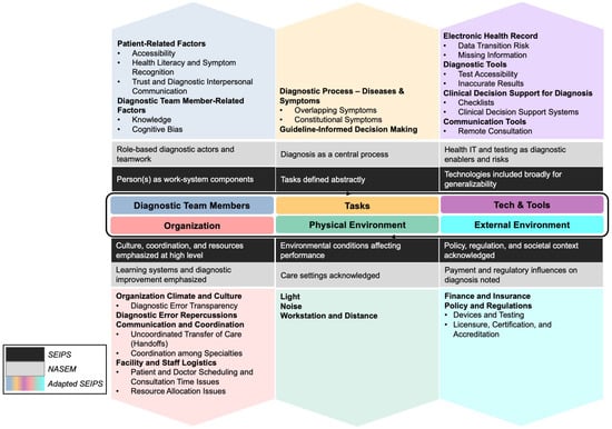 During literature synthesis, we identified diagnosis-relevant contributors that are conceptually acknowledged in SEIPS and the NASEM adaptation but are not explicitly delineated or consistently operationalized. SEIPS maintains high-level categories to preserve generalizability across healthcare work systems, while NASEM prioritizes diagnostic outcomes and improvement strategies over detailed mechanism specification. To address this gap, we operationalized each SEIPS domain at a lower level of abstraction by introducing diagnosis-specific subcategories that clarify how particular sociotechnical mechanisms influence diagnostic performance (Figure 1):