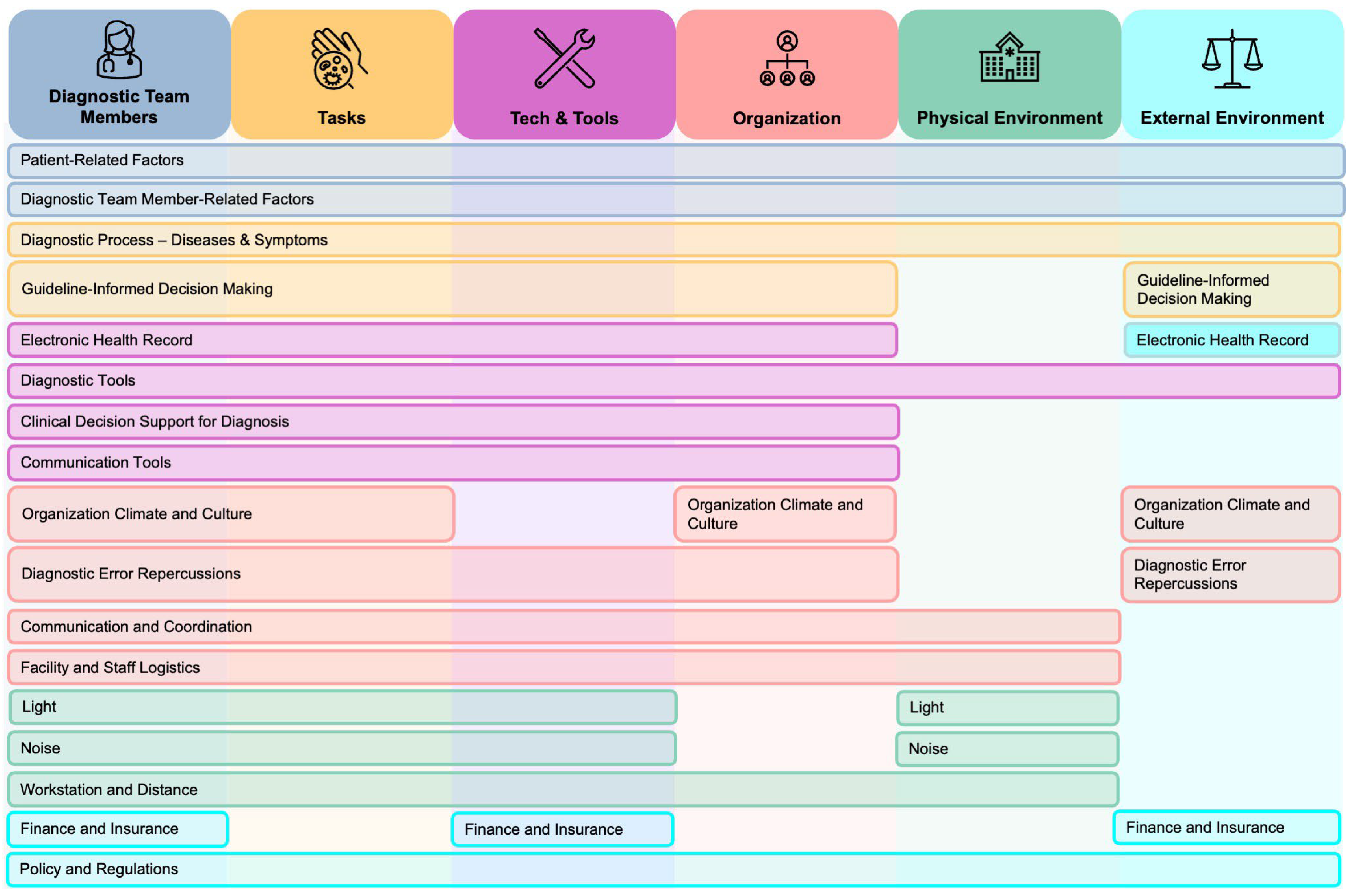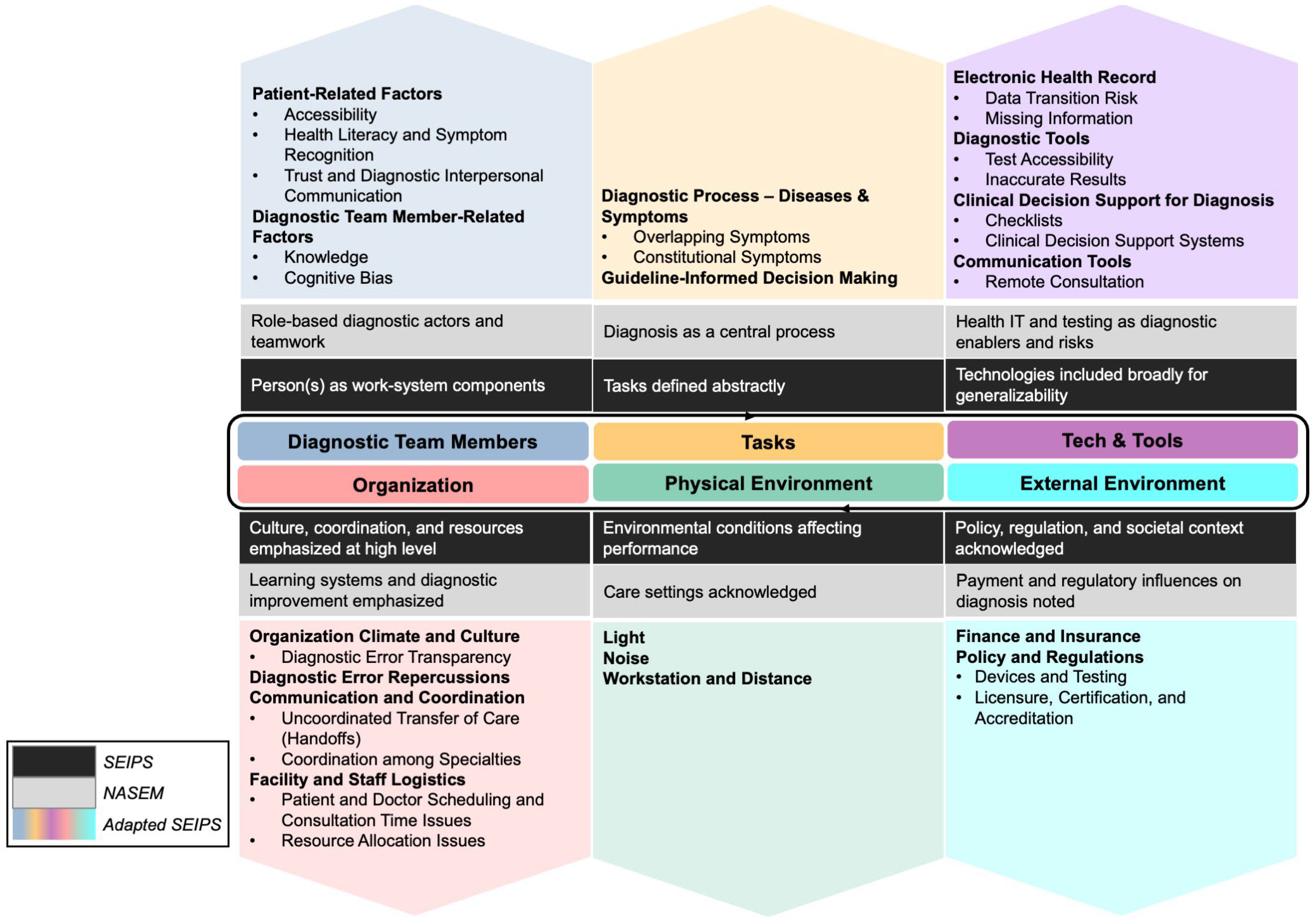 - Technologies and Tools: SEIPS addresses technologies broadly in terms of usability and fit, while NASEM emphasizes health information technology as both an enabler and a source of diagnostic risk. To reflect diagnosis-specific technological contributors while maintaining the SEIPS structure, we added Diagnostic Tests as a distinct subcategory to represent diagnostic tests and related technologies, including issues of Test Accessibility and Inaccurate Results. We also explicitly included Clinical Decision Support for Diagnosis, encompassing both Checklists and computerized Clinical Decision Support Systems (CDSS), to capture how decision aids can mitigate premature closure while also introducing risks related to automation bias, limited generalizability, and reduced transparency.