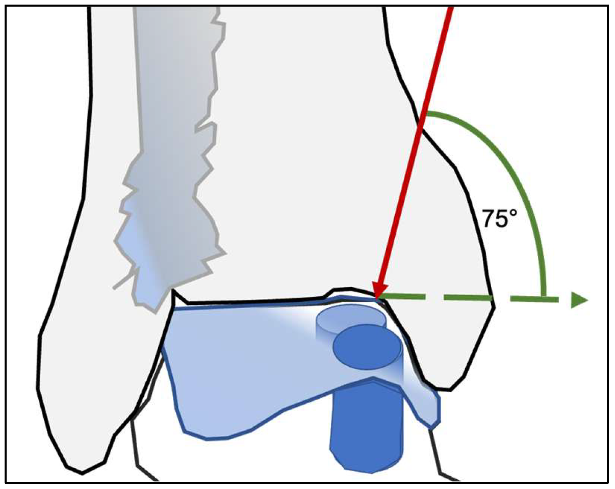 Surgical access to the talar dome was determined by the location of the lesion. Medial lesions were approached through a medial malleolar osteotomy, whereas lateral lesions required an osteotomy of the distal fibula. To ensure adequate visualization of the talar dome and a safe working corridor, the osteotomy was performed with a minimum inclination of approximately 75°. This steep osteotomy angle allows controlled elevation of the malleolar fragment while preserving sufficient cortical stability for subsequent fixation (Figure 1).