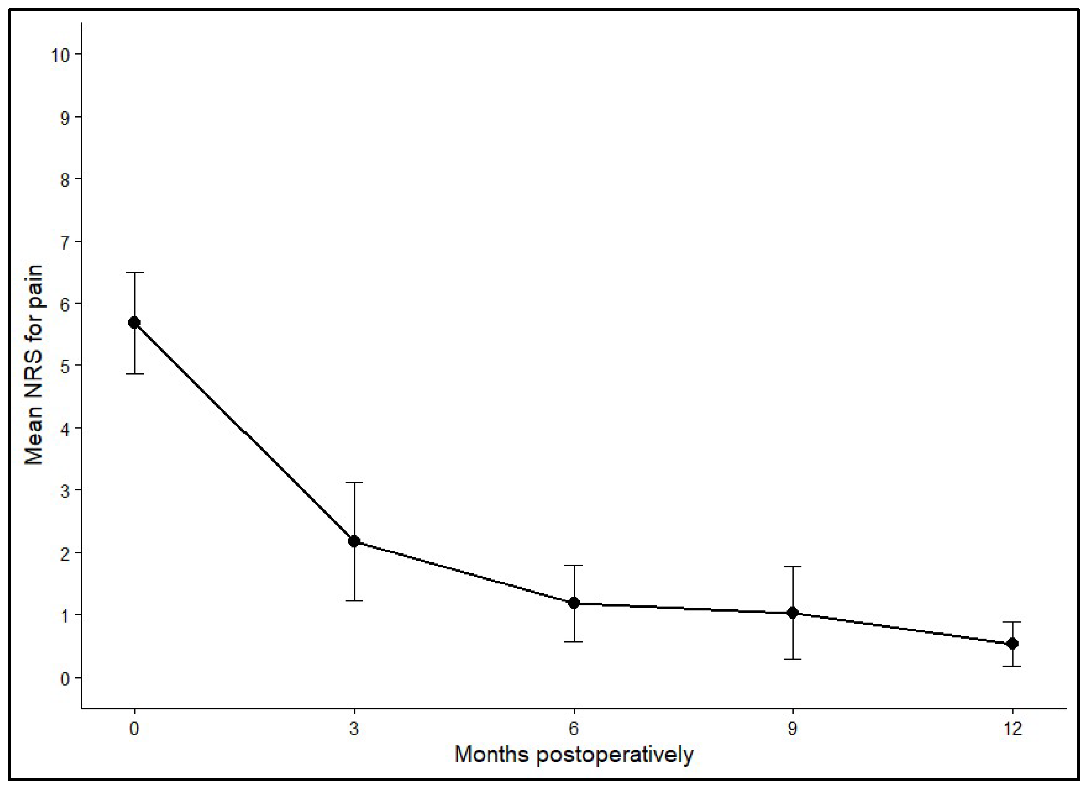 Mean NRS with 95% confidence intervals at baseline (0), 3, 6, 9, and 12+ months postoperatively.