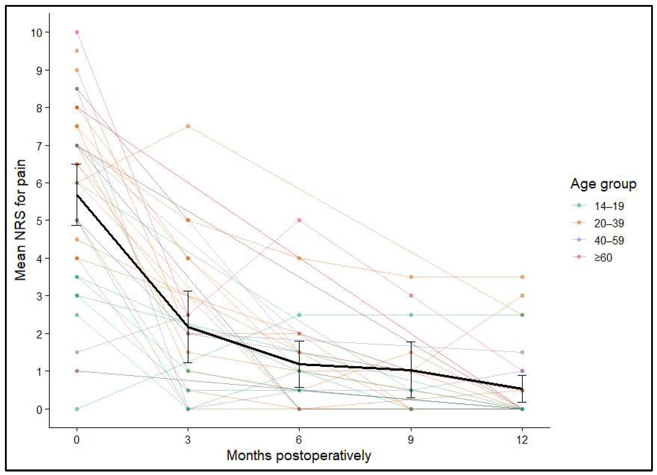 Statistical analysis using Generalized Estimating Equations (GEEs) demonstrated a significant temporal effect on pain reduction (p < 0.001). Pairwise comparisons confirmed that pain levels at every postoperative timepoint were significantly lower than before surgery (all p < 0.001). Additional improvements were evident between 3 and 6 months (p = 0.029), 3 and 9 months (p = 0.021), 3 and 12 months (p < 0.001), and between 6 and 12 months (p = 0.012). By contrast, no meaningful differences were observed between the 6- and 9-month or the 9- and 12-month assessments, indicating that most pain relief occurred within the first half-year and then remained stable. Figure 3 and Figure 4 illustrate the average NRS score and its 95% confidence interval across these times post-operatively.