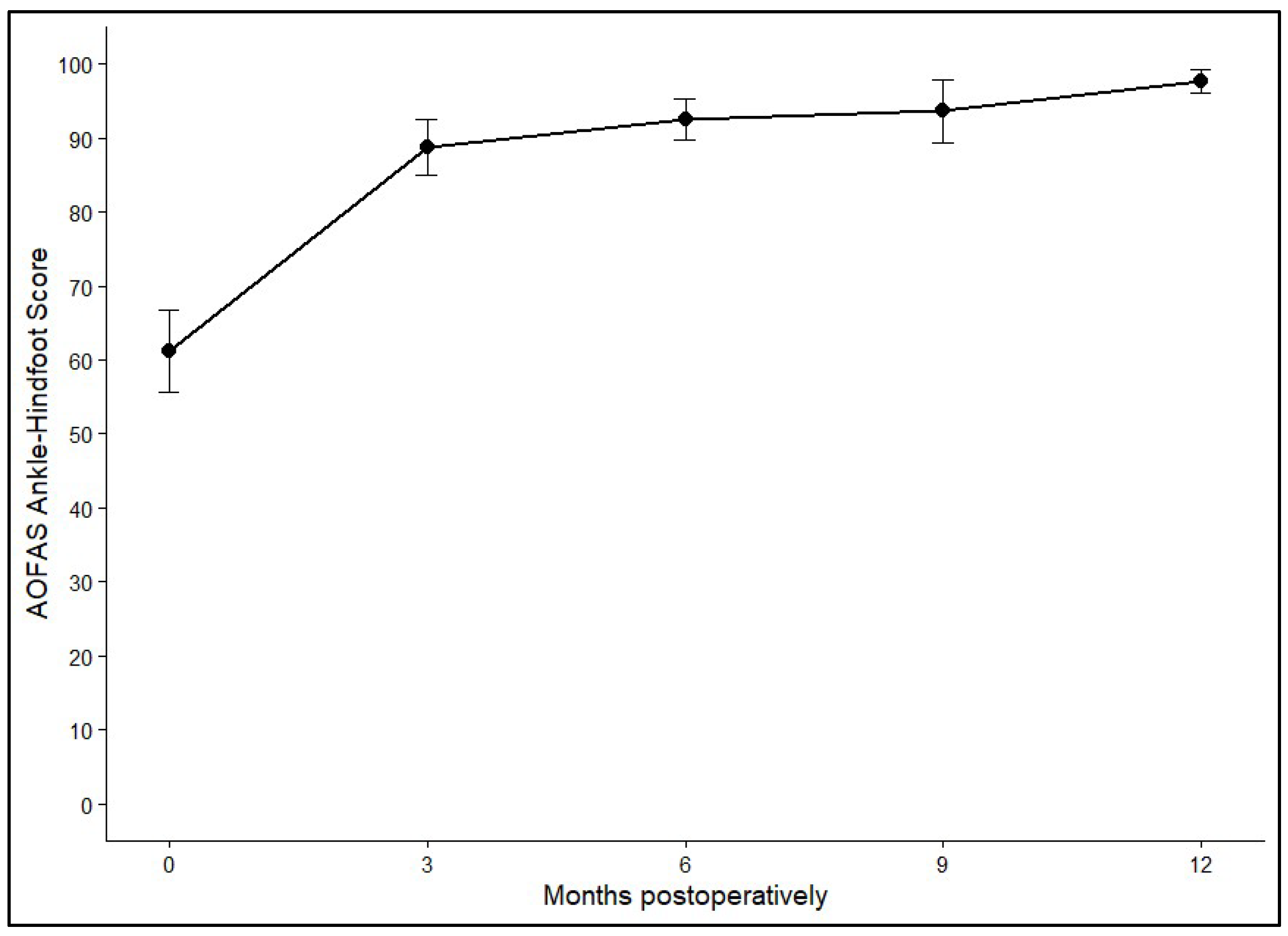 Mean AOFAS Ankle–Hindfoot Scores at baseline and at 3, 6, 9, and 12+ months postoperatively. Error bars represent 95% confidence intervals.